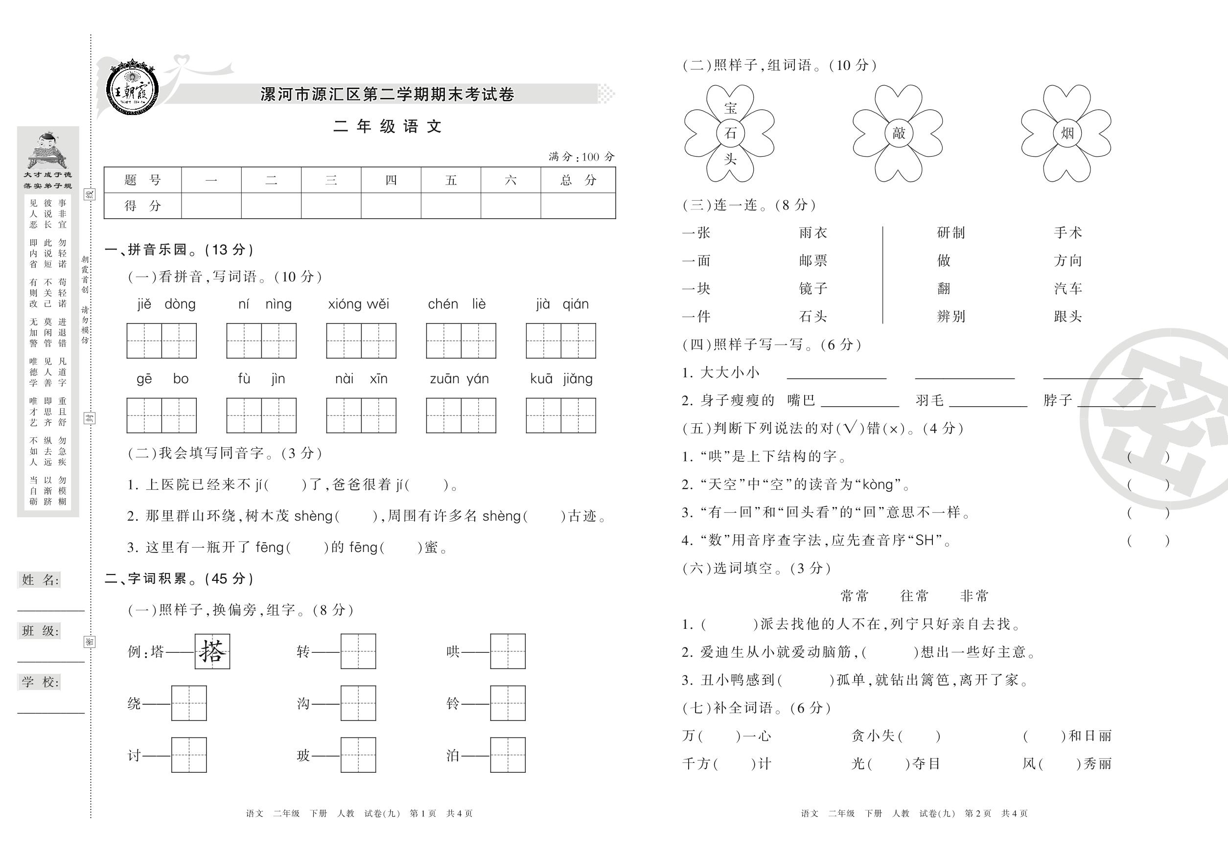 2015-2016学年第二学期漯河市源汇区二年级语文试卷(人教版)【9】