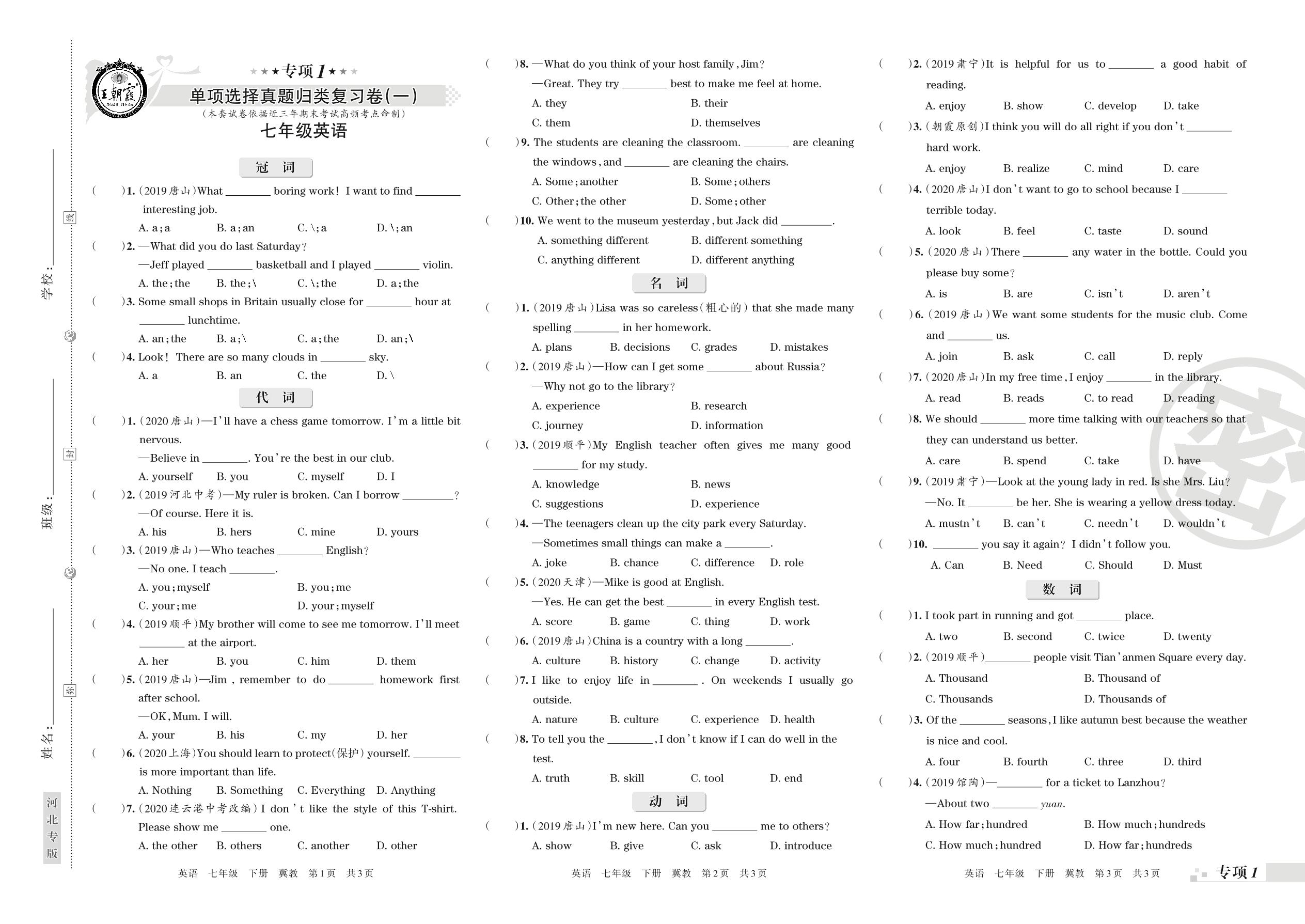 王朝霞期末专项卷——单项选择(一)、(二)真题归类复习七年级下册数学(冀教版)【0】