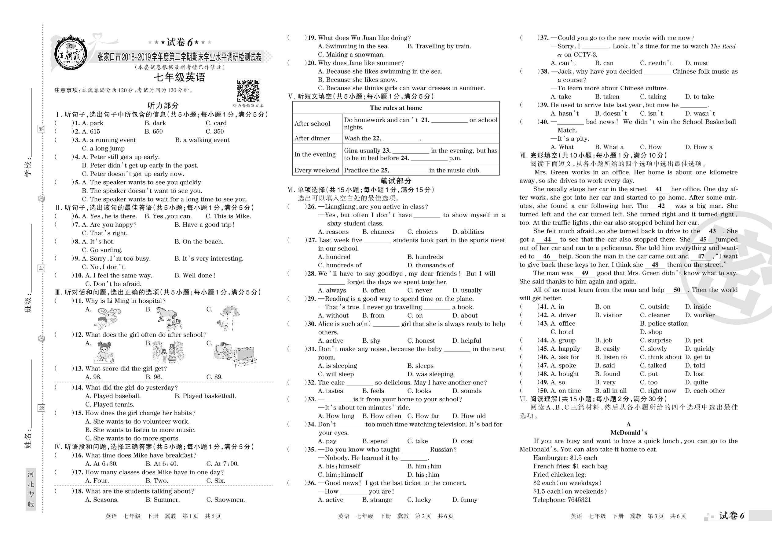 2018-2019学年第二学期张家口市七年级数学试卷(冀教版)【6】