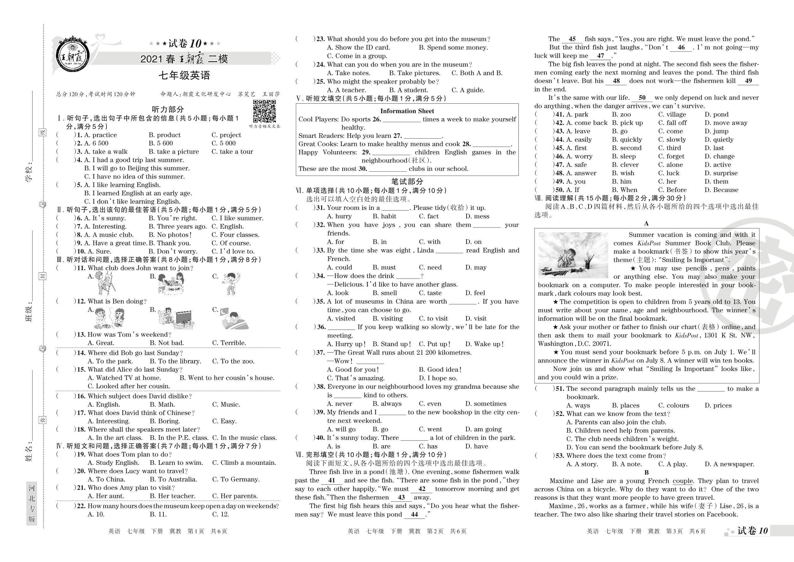 王朝霞期末模拟卷七年级下册数学(冀教版)_R210805150039【10】