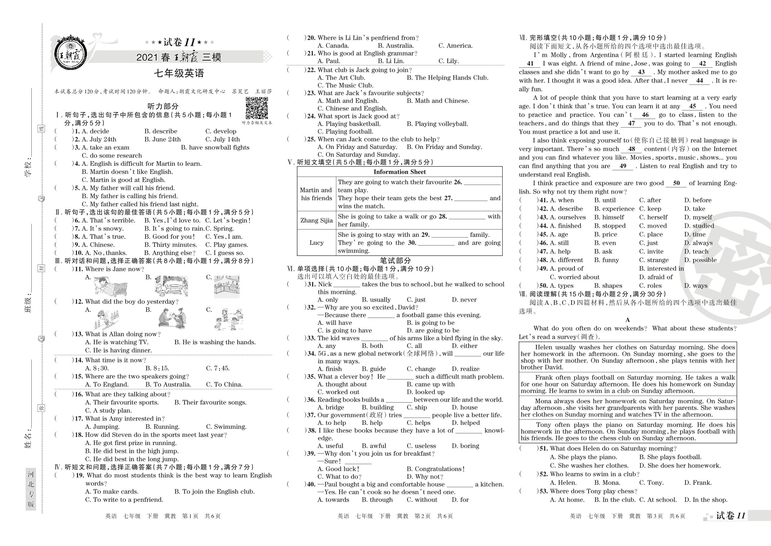 王朝霞期末模拟卷七年级下册数学(冀教版)_R210805150100【11】
