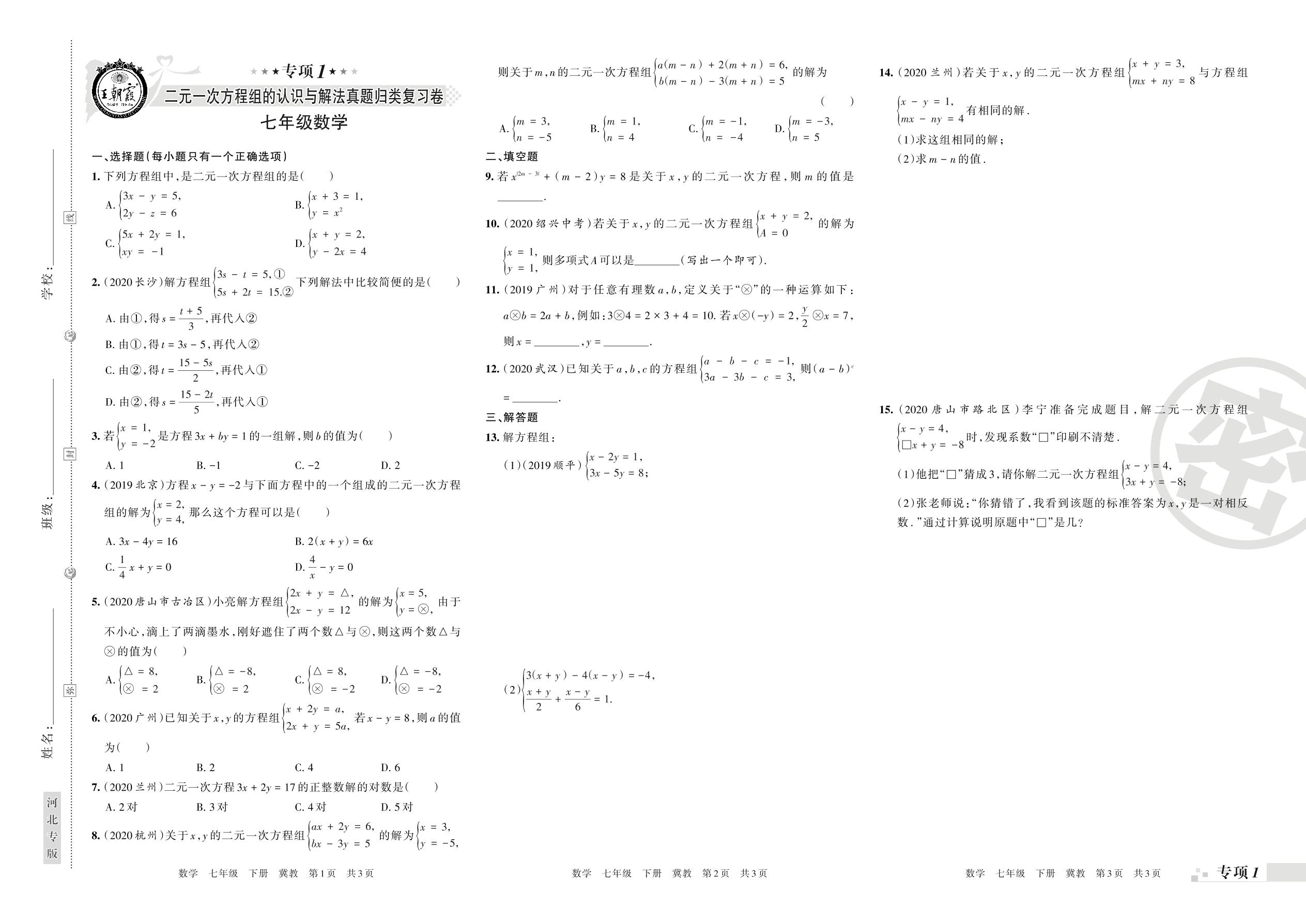 王朝霞期末专项卷——二元一次方程组的认识与解法、二元一次方程组的应用真题归类复习七年级下册数学(冀教版)_R210805150121【0】