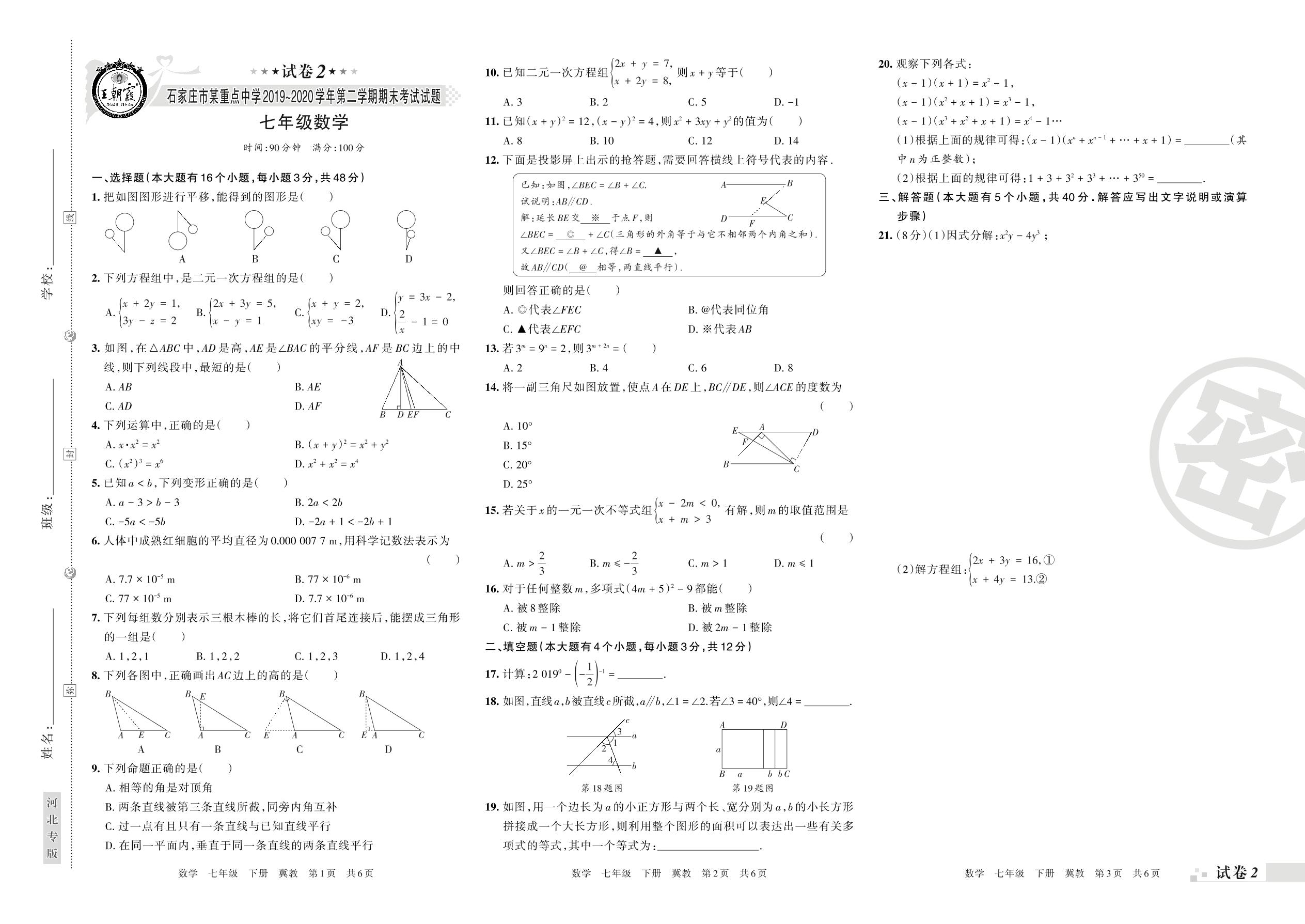 2019-2020学年第二学期石家庄市某重点中学七年级数学试卷(冀教版)【2】