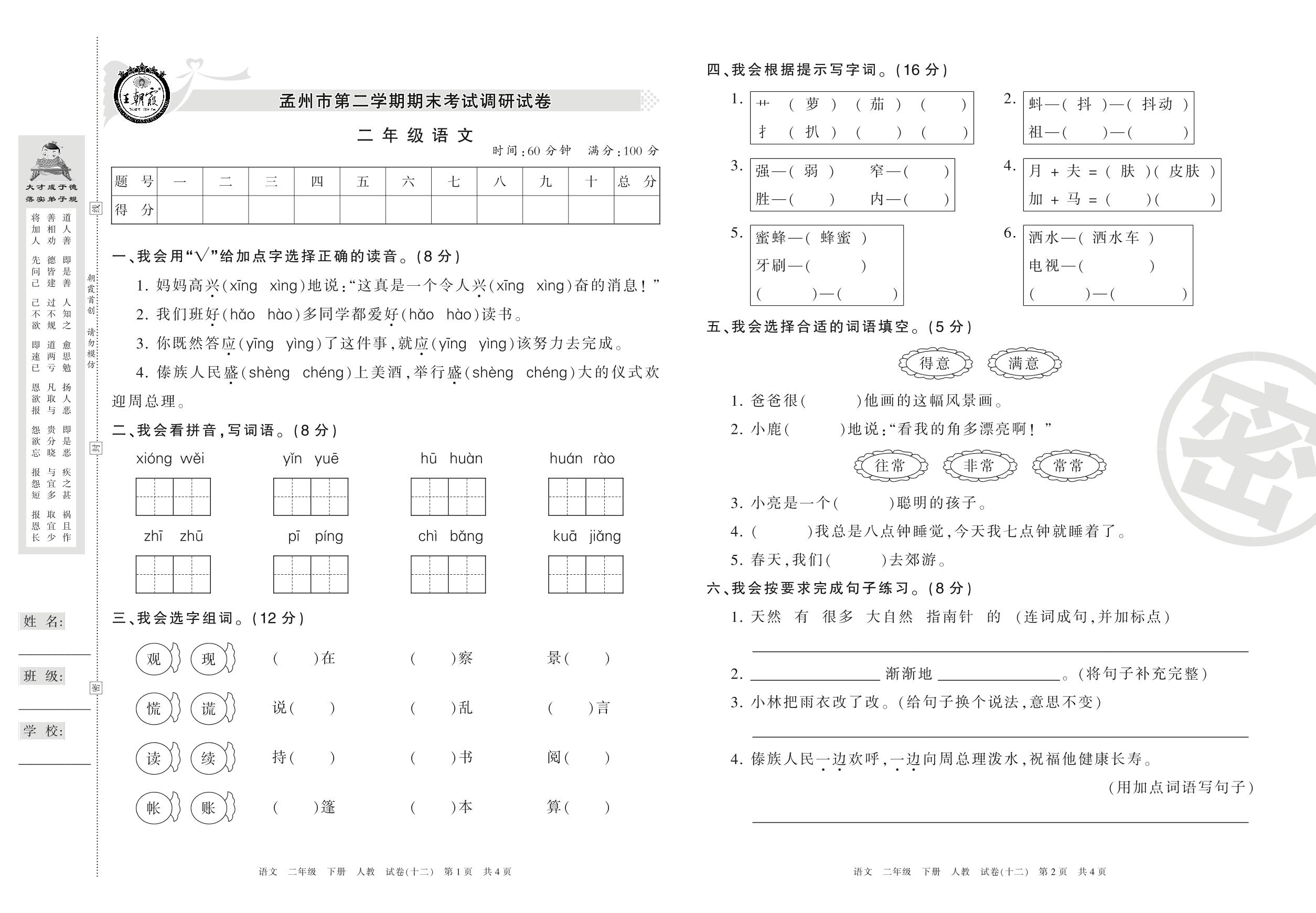 2015-2016学年第二学期孟州市二年级语文试卷(人教版)【12】