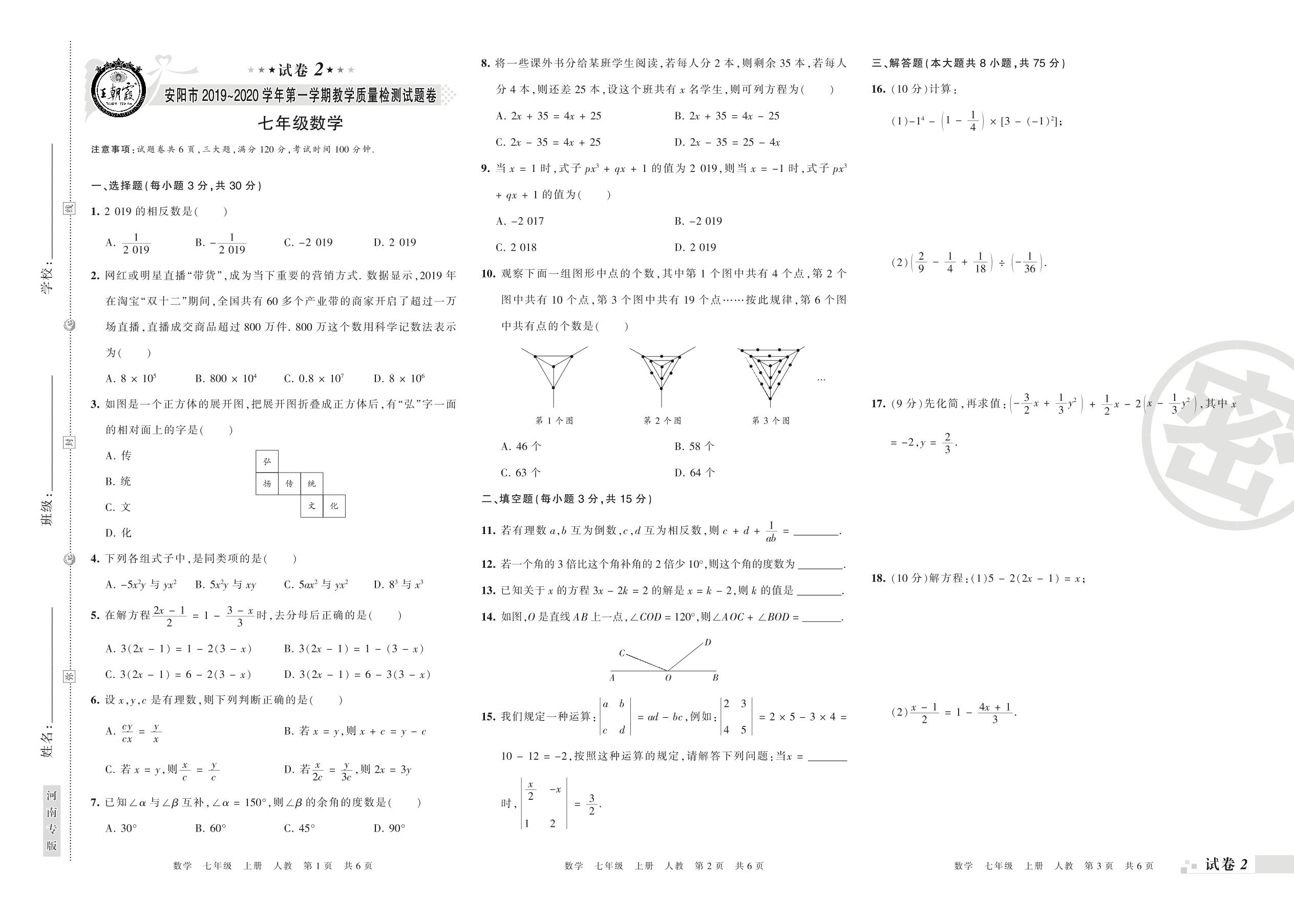 2019-2020学年第一学期安阳市七年级数学试卷(人教版)【2】