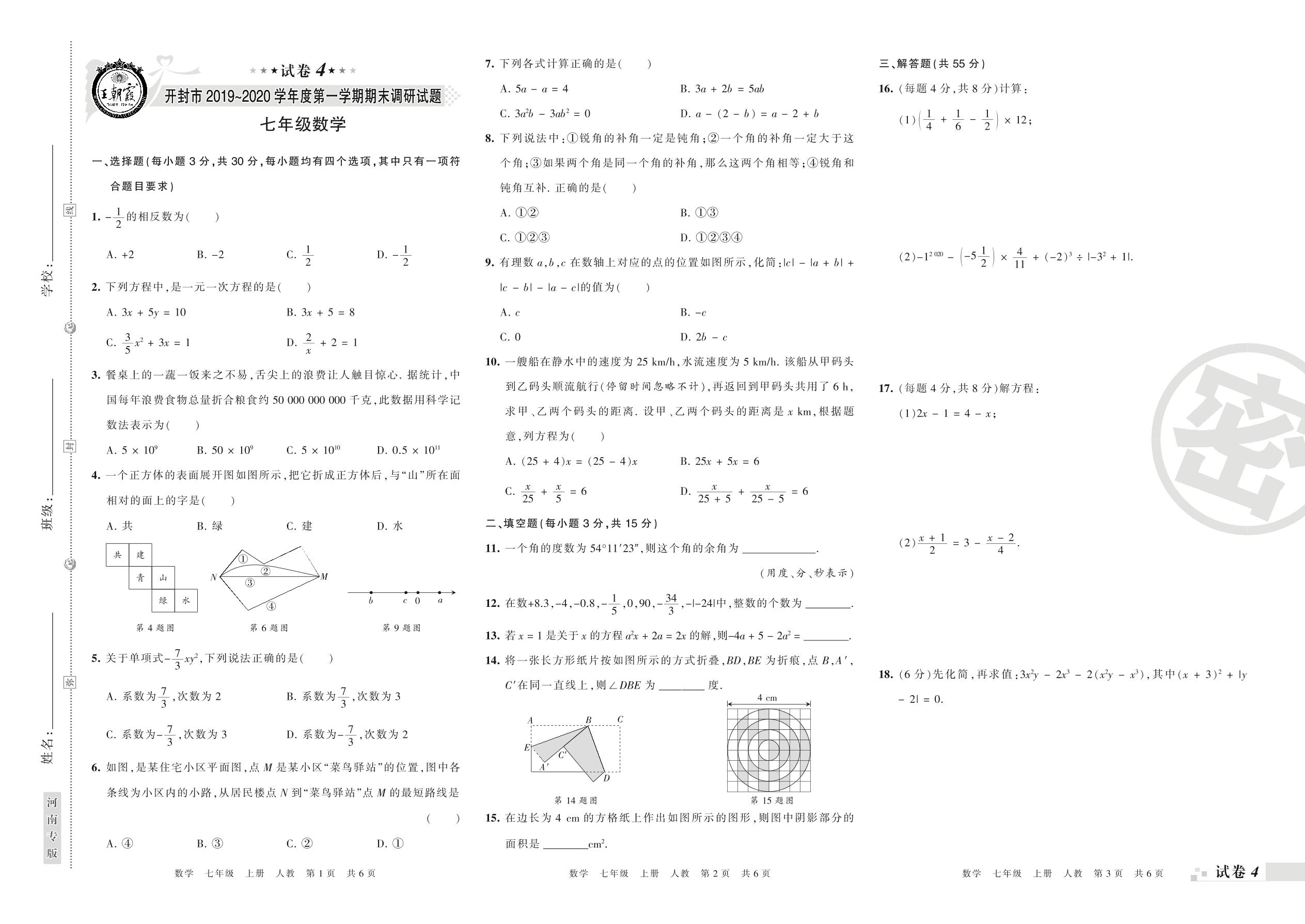 2019-2020学年第一学期开封市七年级数学试卷(人教版)【4】