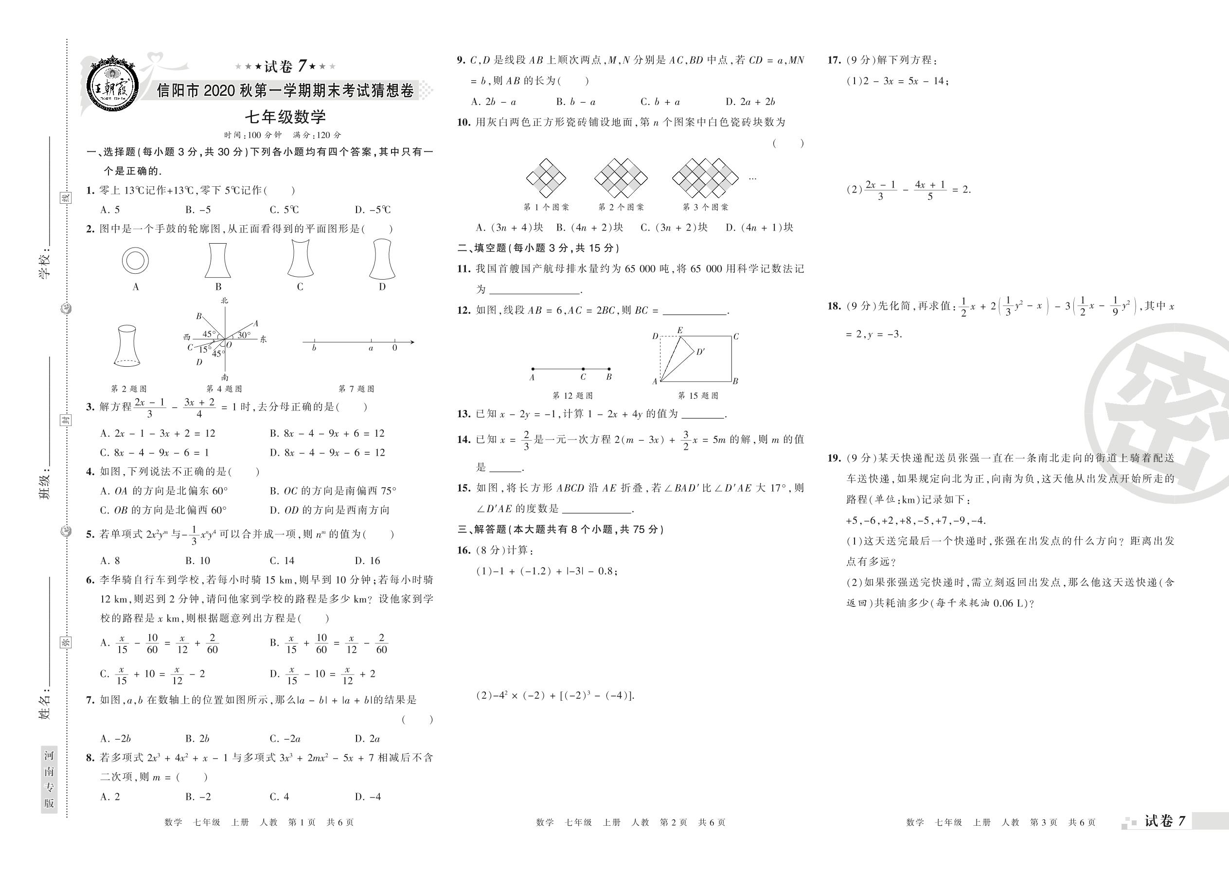 2019-2020学年第一学期信阳市七年级数学试卷(人教版)【7】