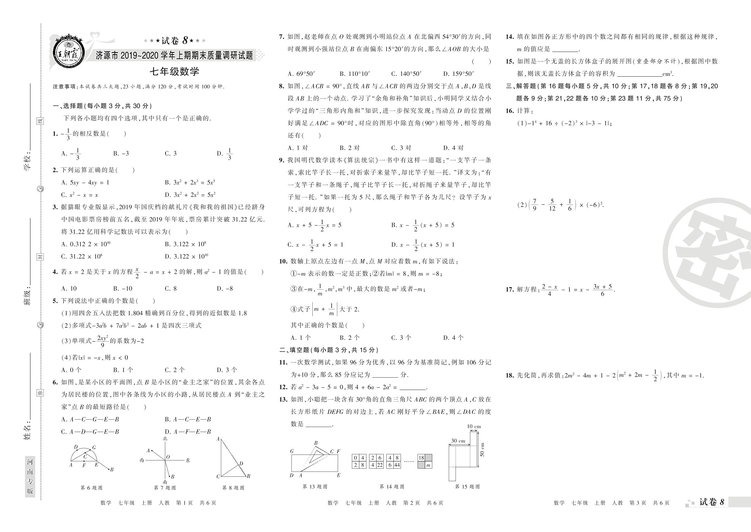 2019-2020学年第一学期济源市七年级数学试卷(人教版)【8】