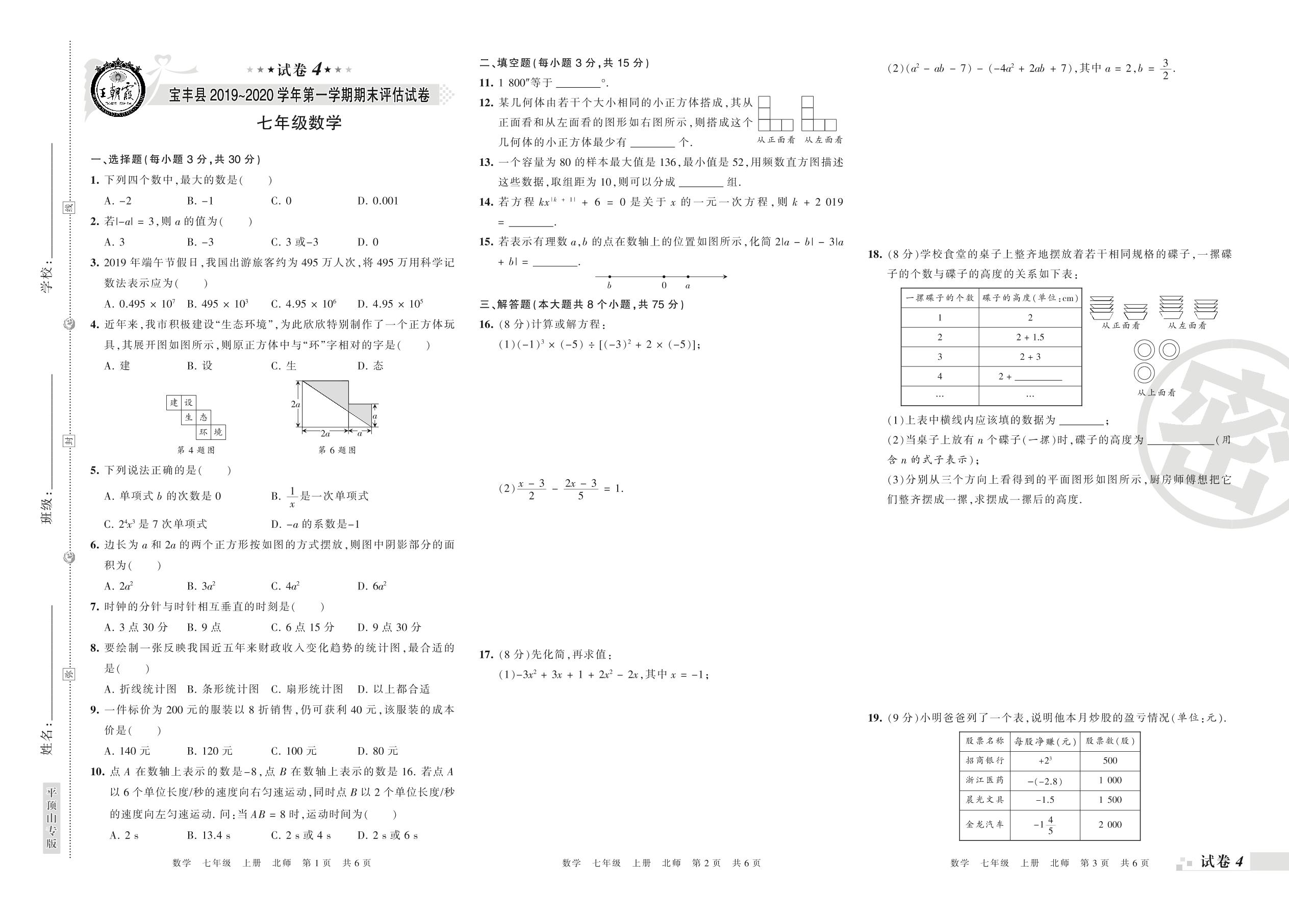2019-2020学年第一学期平顶山市宝丰县七年级数学试卷(北师版)【4】