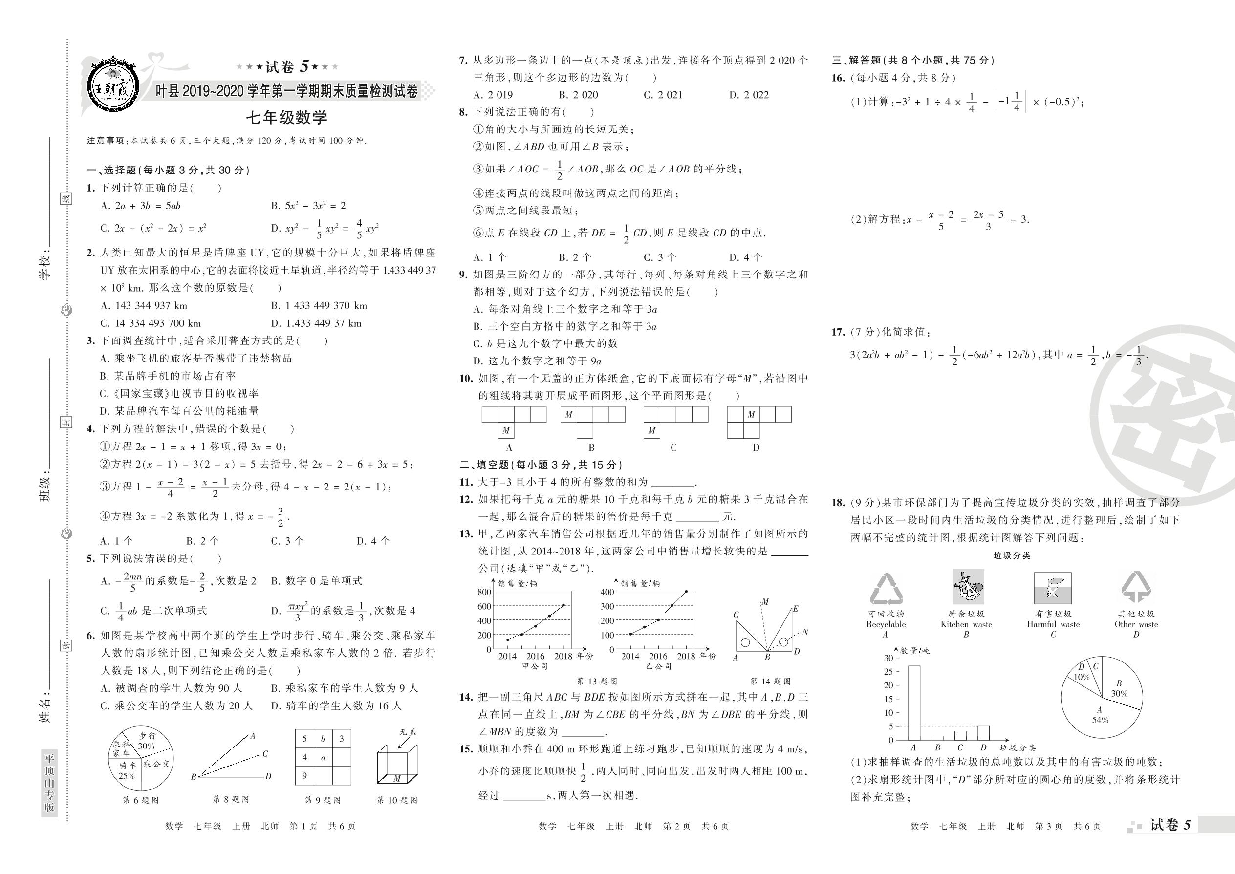 2019-2020学年第一学期平顶山市叶县七年级数学试卷(北师版)【5】