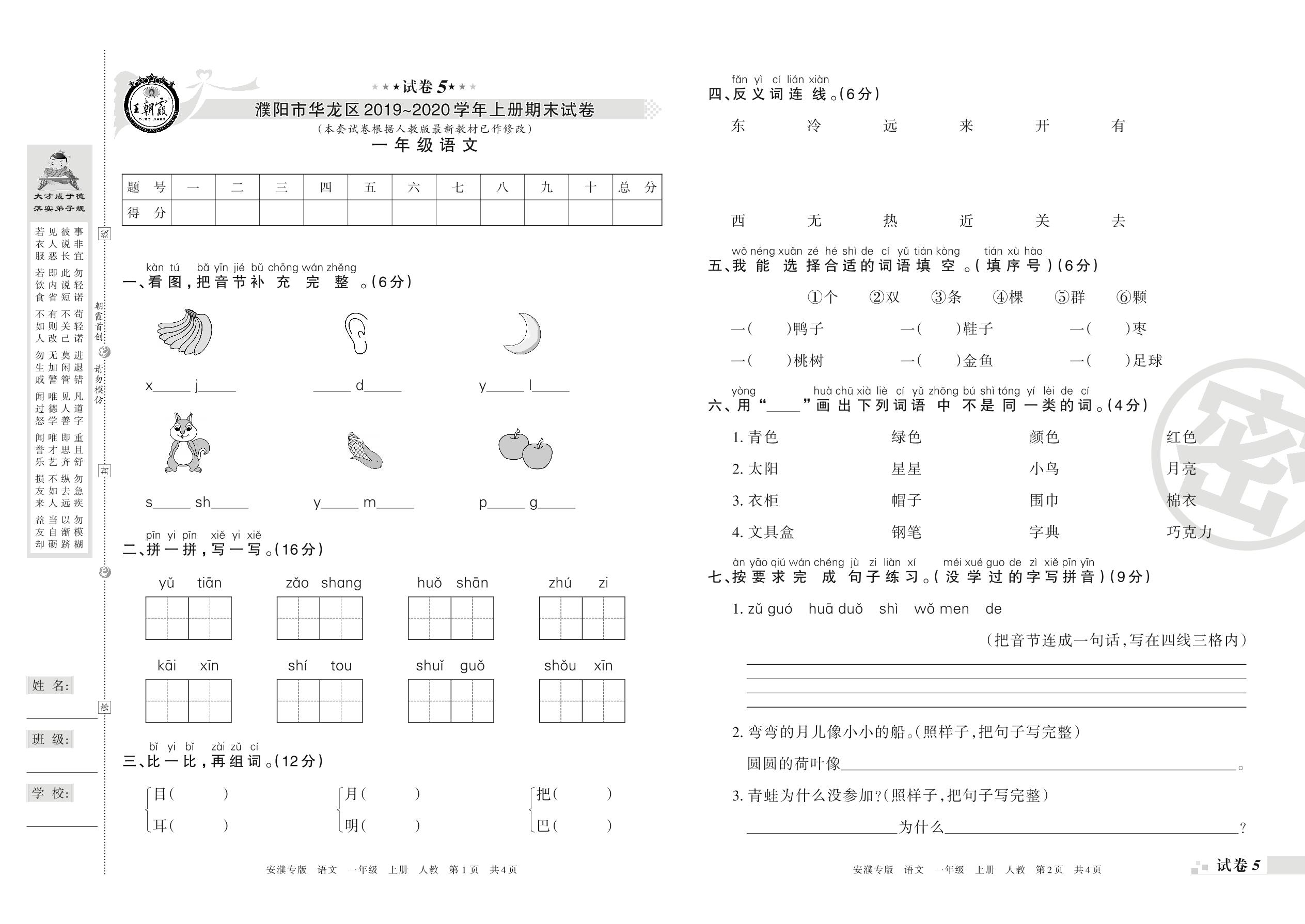 2019-2020学年第一学期濮阳市华龙区一年级语文试卷(人教版)【5】