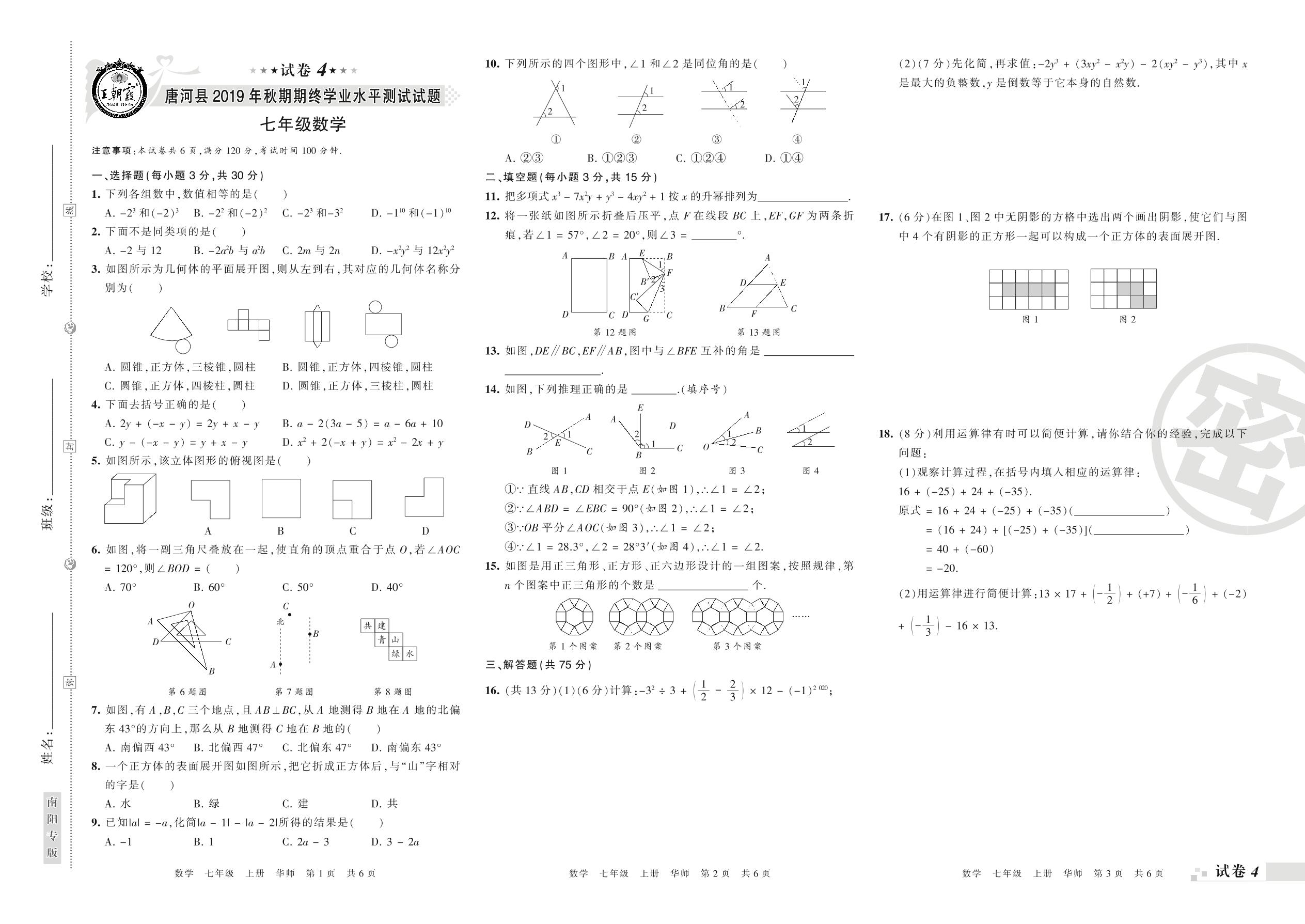 2019-2020学年第一学期南阳市唐河县七年级数学试卷(华师版)【4】