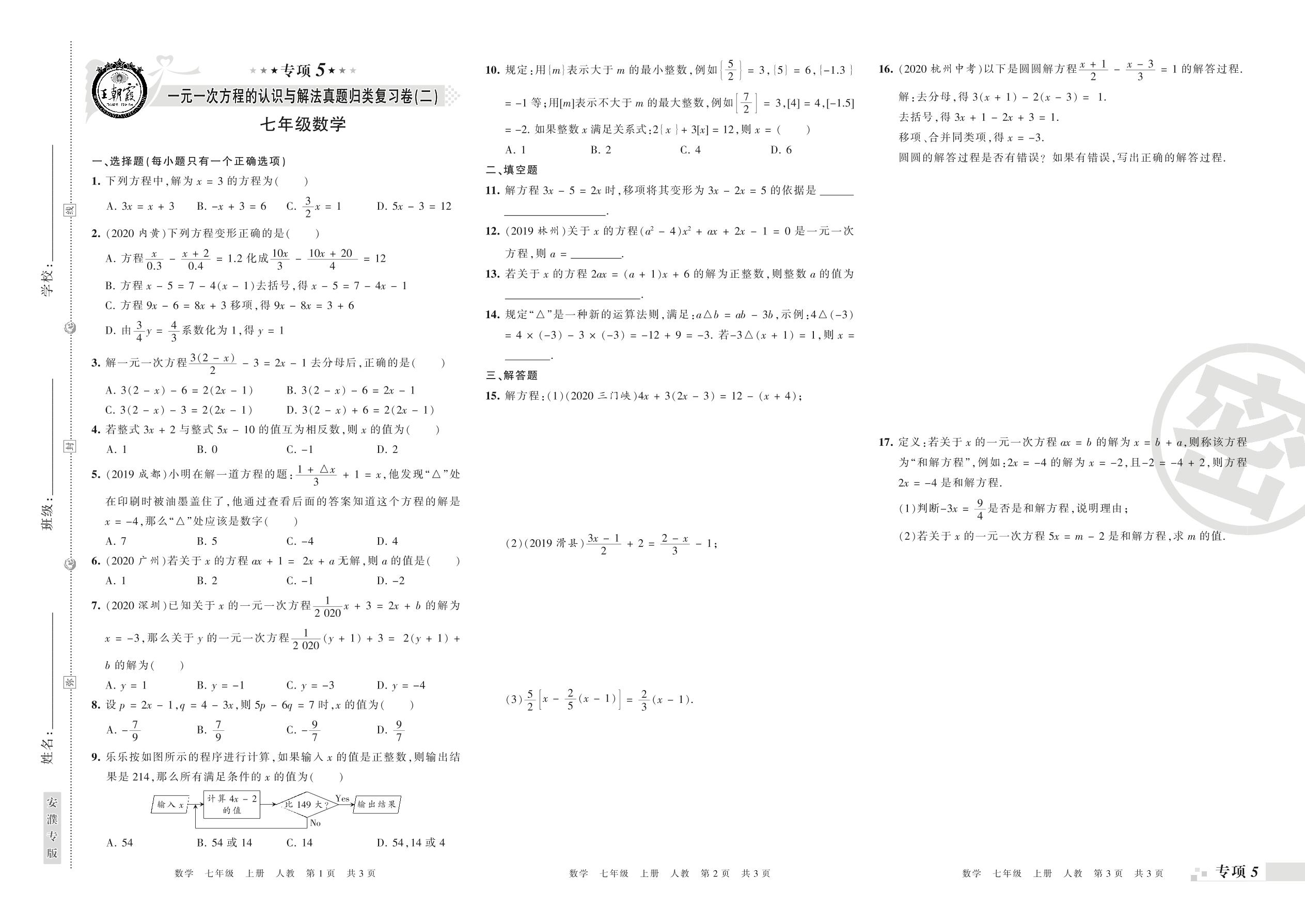 王朝霞期末专项卷——一元一次方程的认识与解法真题归类复习(二)、一元一次方程的应用真题归类复习七年级上册数学(人教版)
