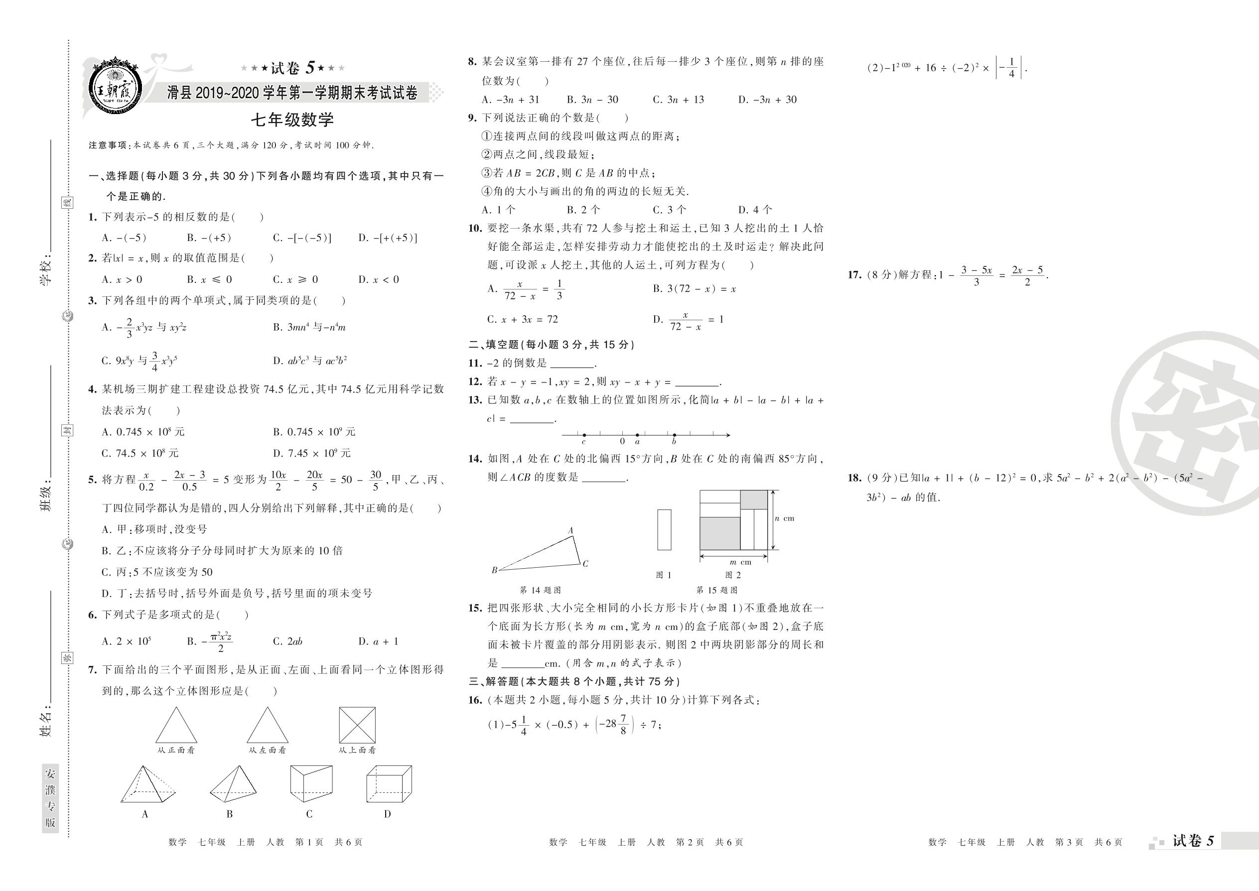 2019-2020学年第一学期安阳市滑县七年级数学试卷(人教版)【5】