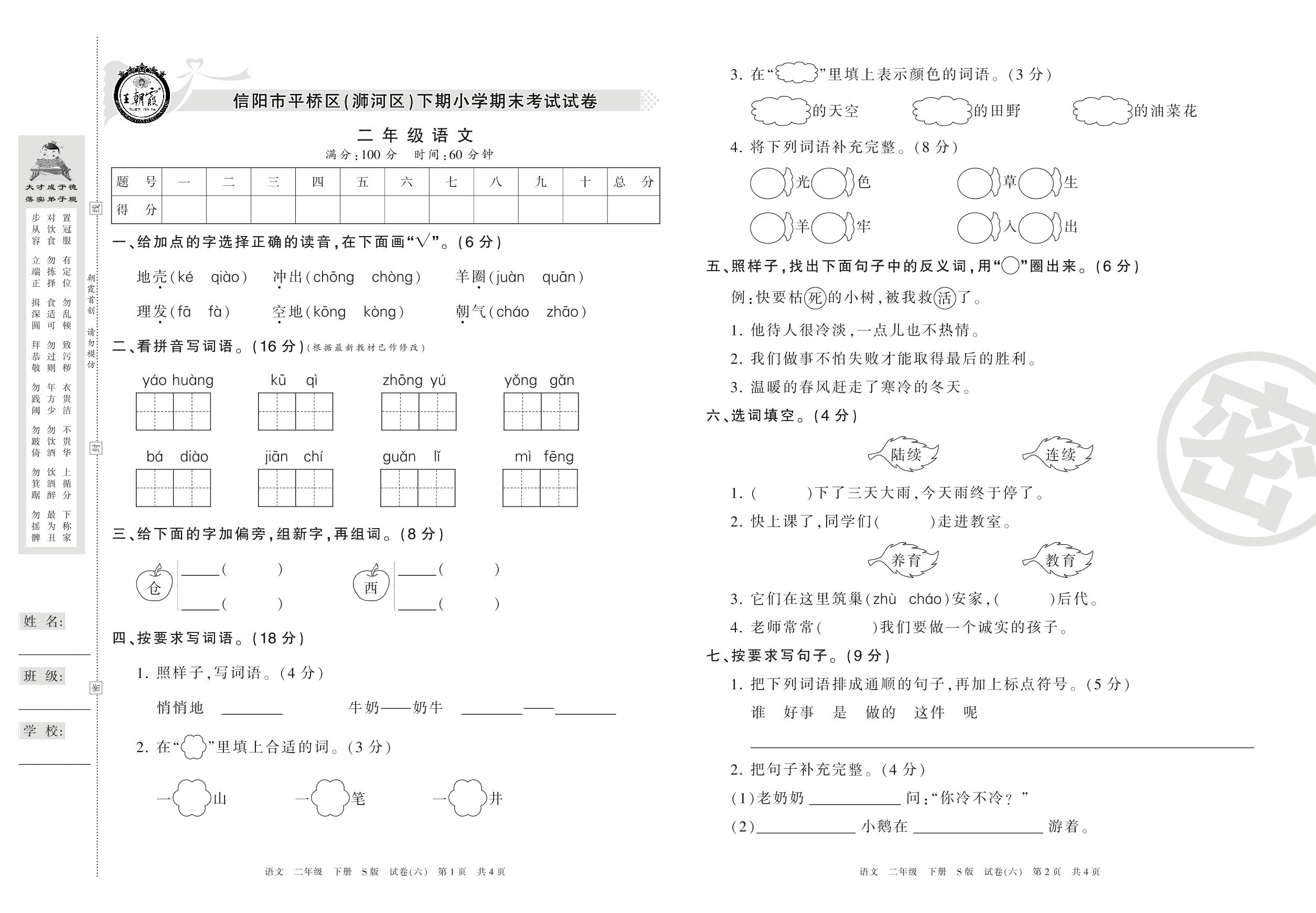 2015-2016学年第二学期信阳市平桥区(浉河区)二年级语文试卷(S版)【6】
