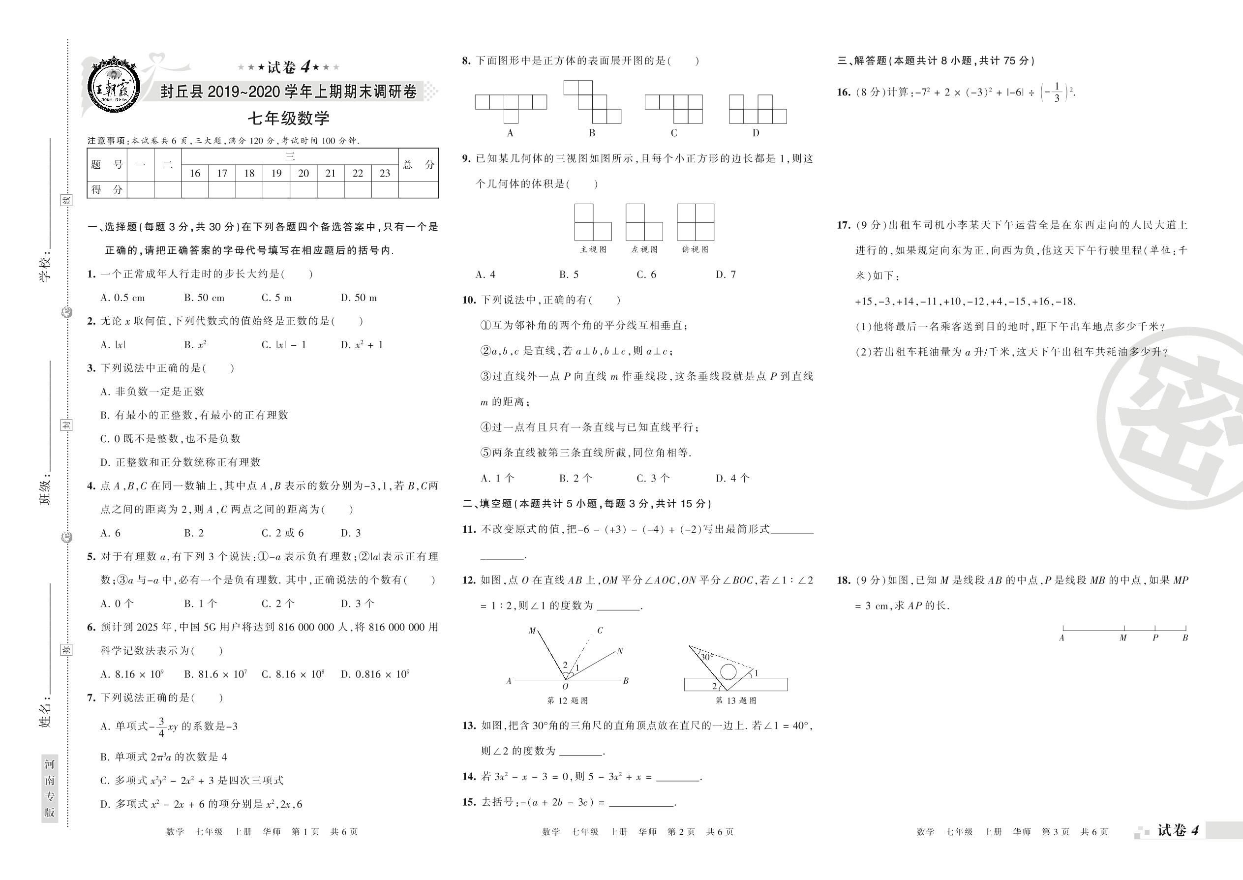 2019-2020学年第一学期新乡市封丘县七年级数学试卷(华师版)【4】