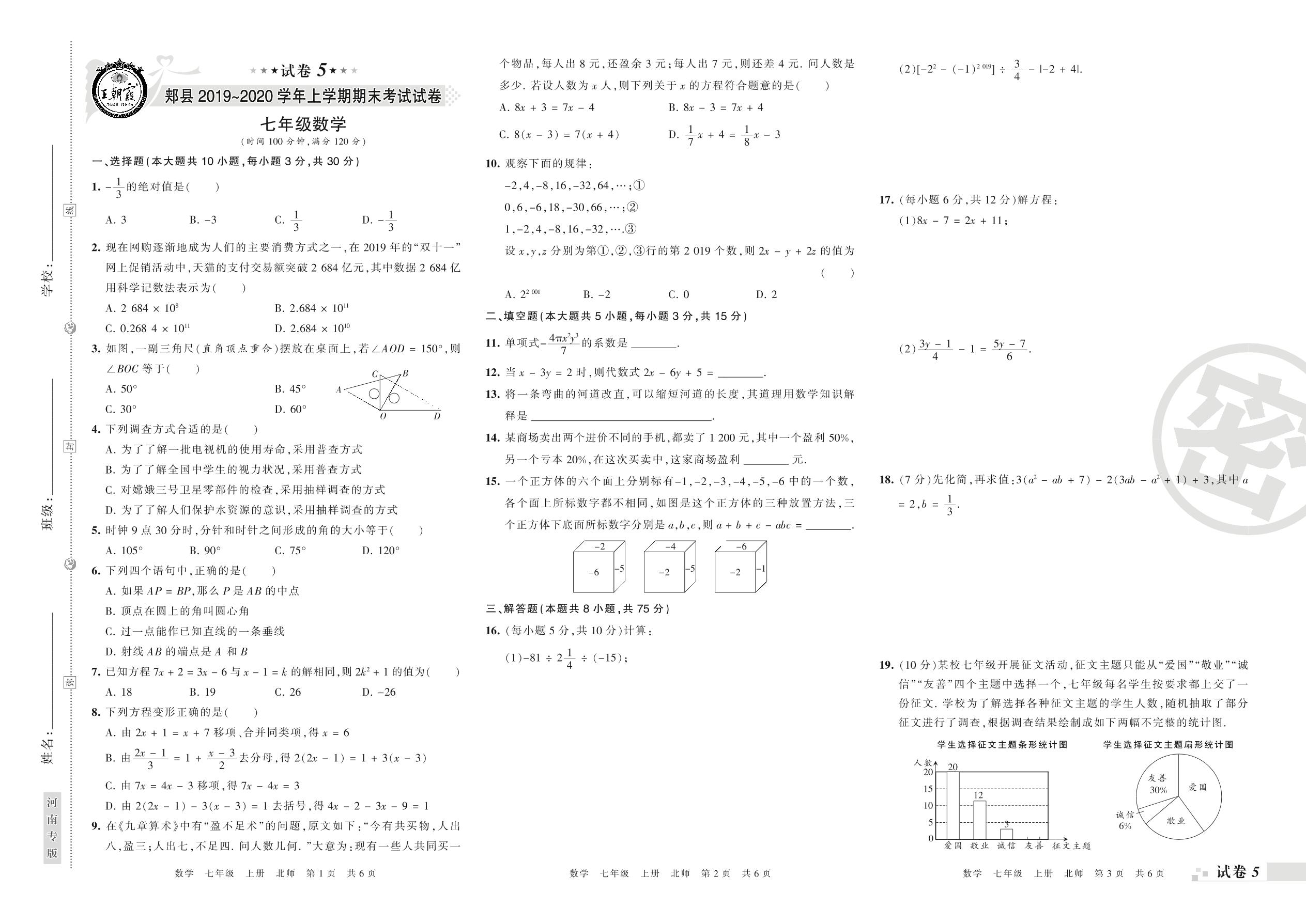 2019-2020学年第一学期平顶山市郏县七年级数学试卷(北师版)【5】