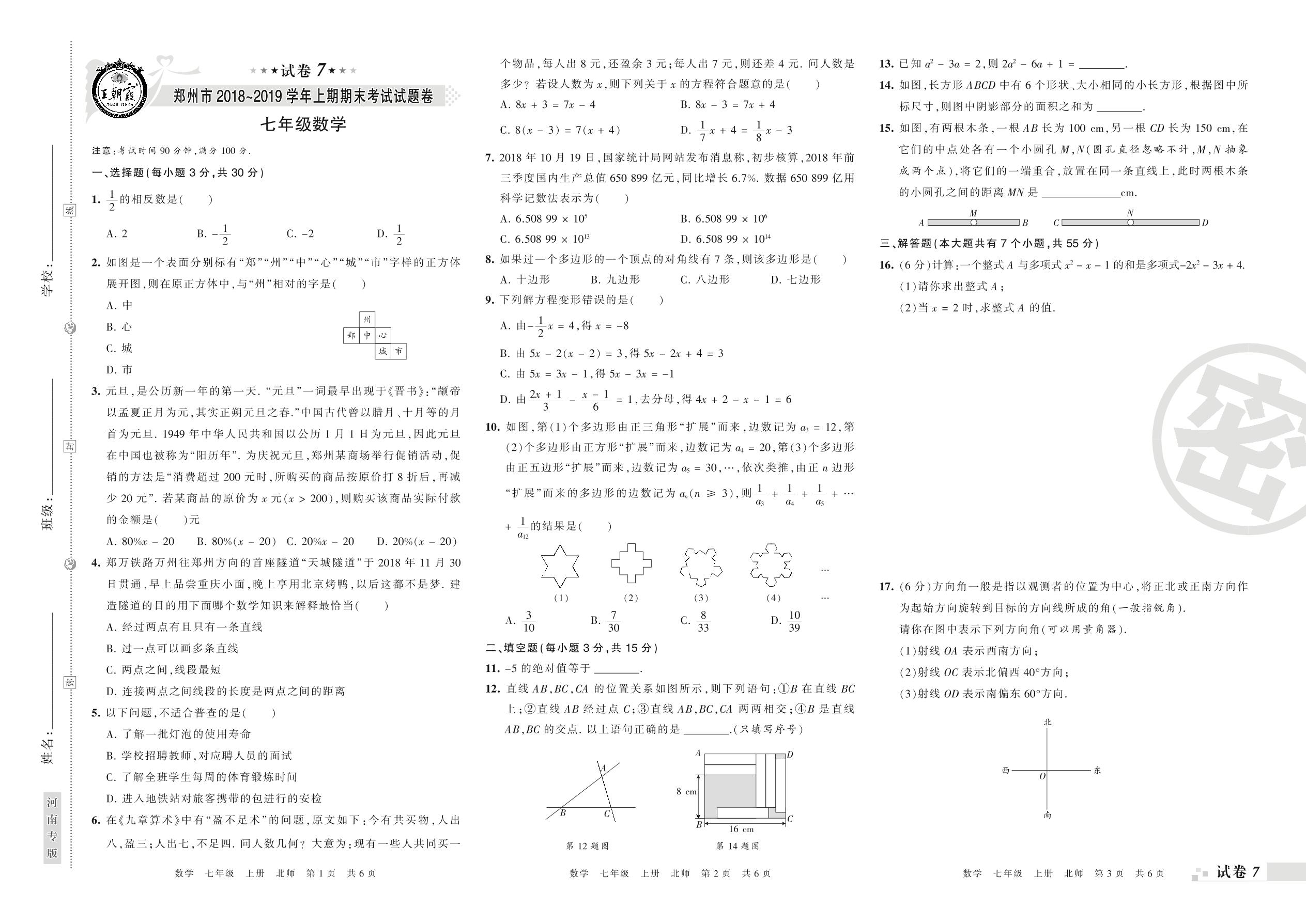 2018-2019学年第一学期郑州市七年级数学试卷(北师版)【7】