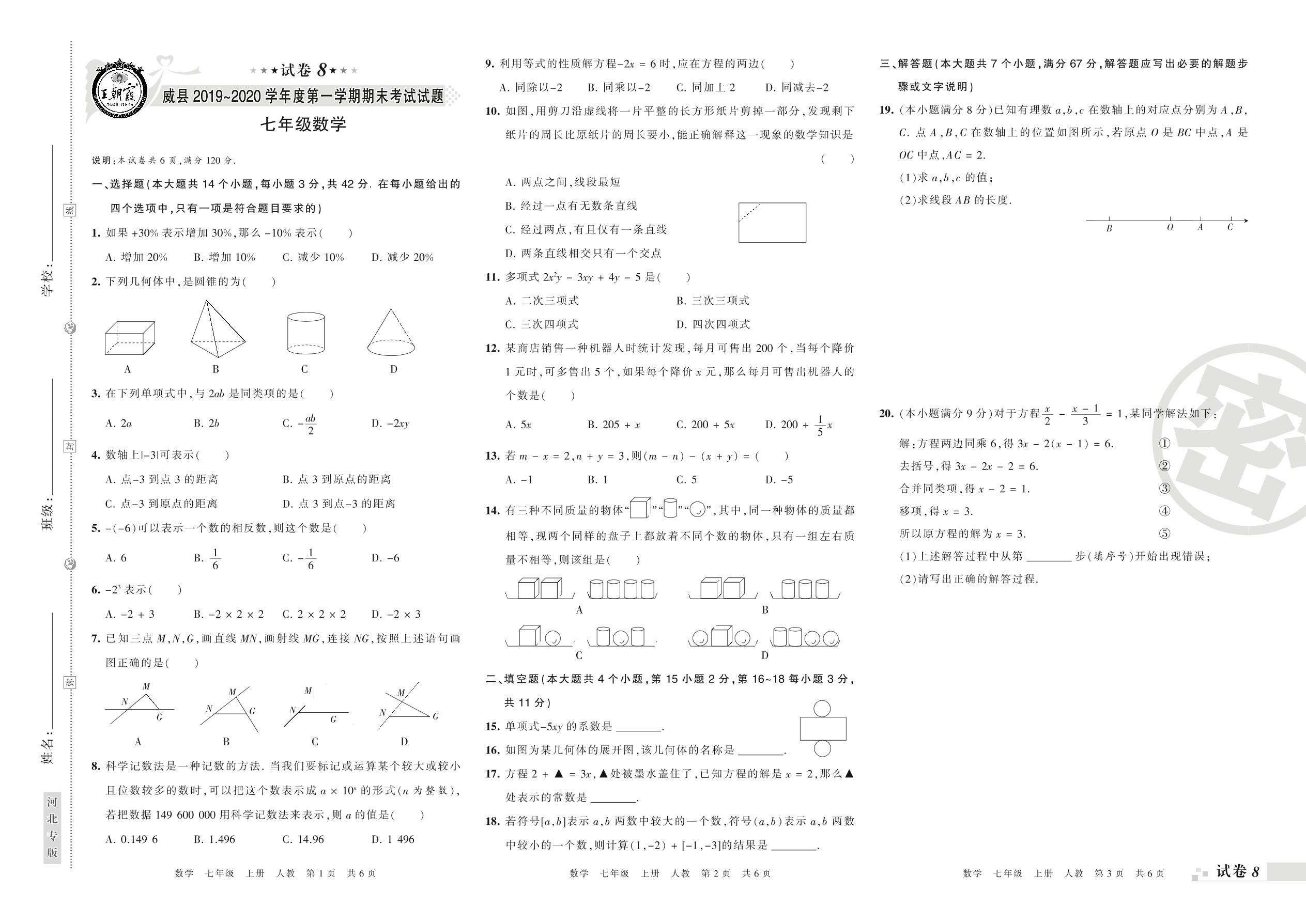 2019-2020学年第一学期邢台市威县七年级数学试卷(人教版)【8】