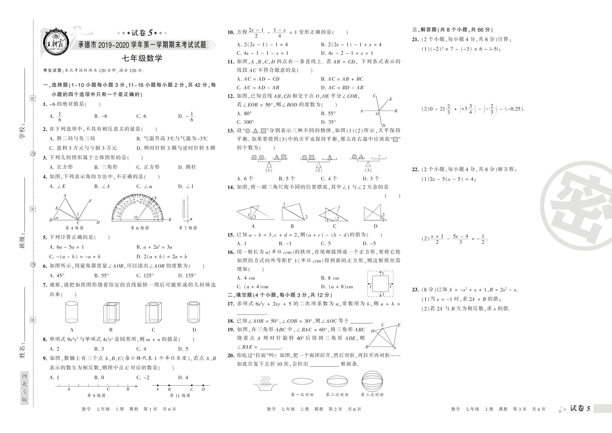 2019-2020学年第一学期承德市七年级数学试卷(冀教版)【5】
