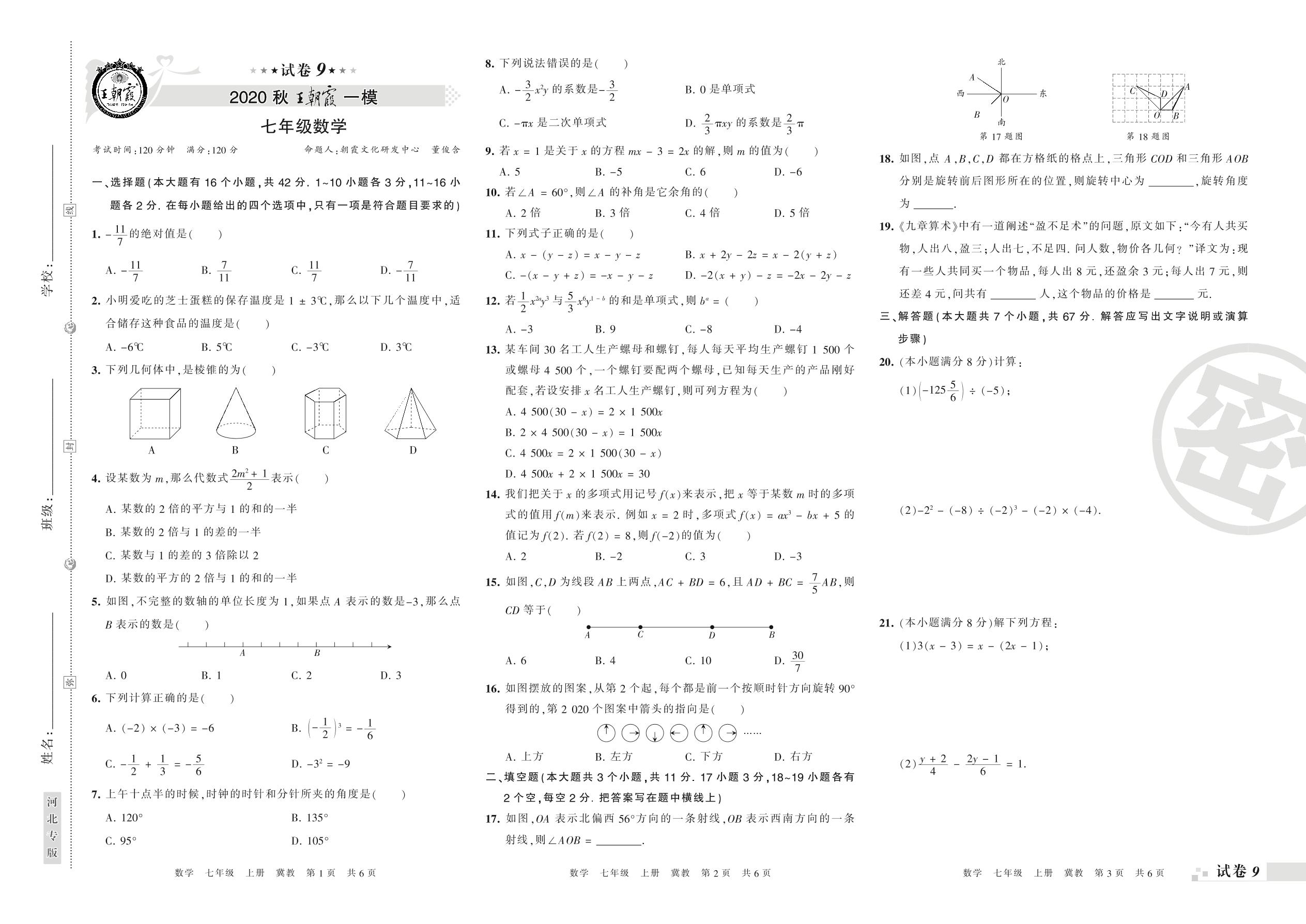 王朝霞期末模拟卷七年级上册数学(冀教版)【9】