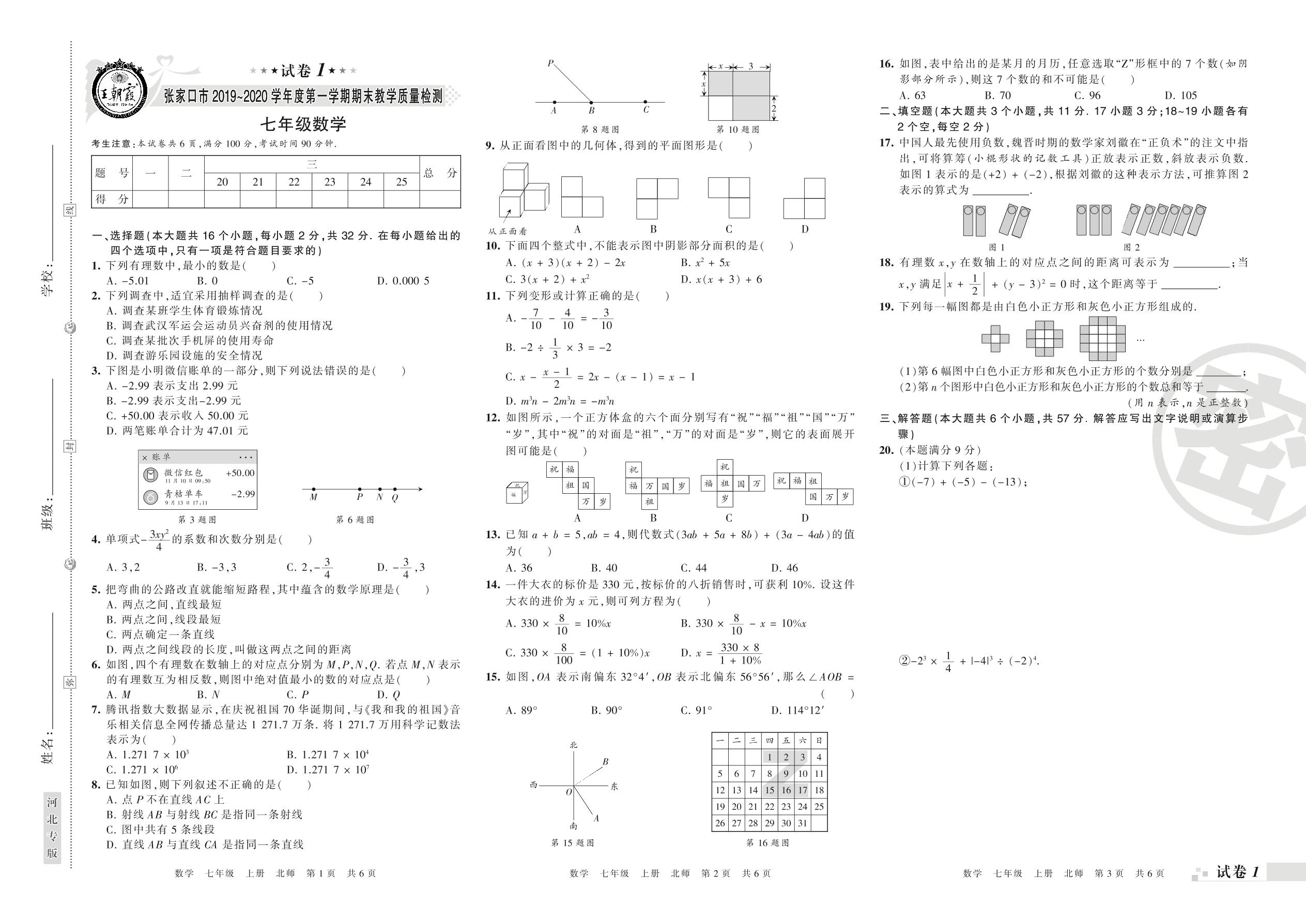 2019-2020学年第一学期张家口市七年级数学试卷(北师版)【1】