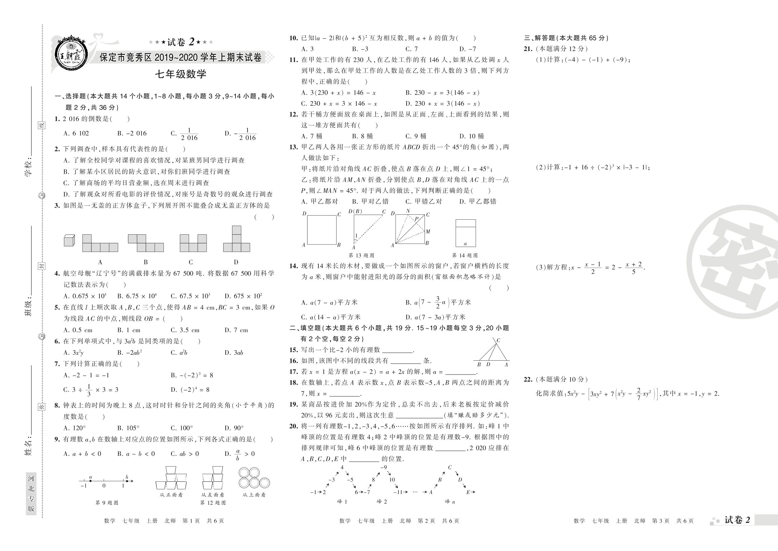 2019-2020学年第一学期保定市竞秀区七年级数学试卷(北师版)【2】