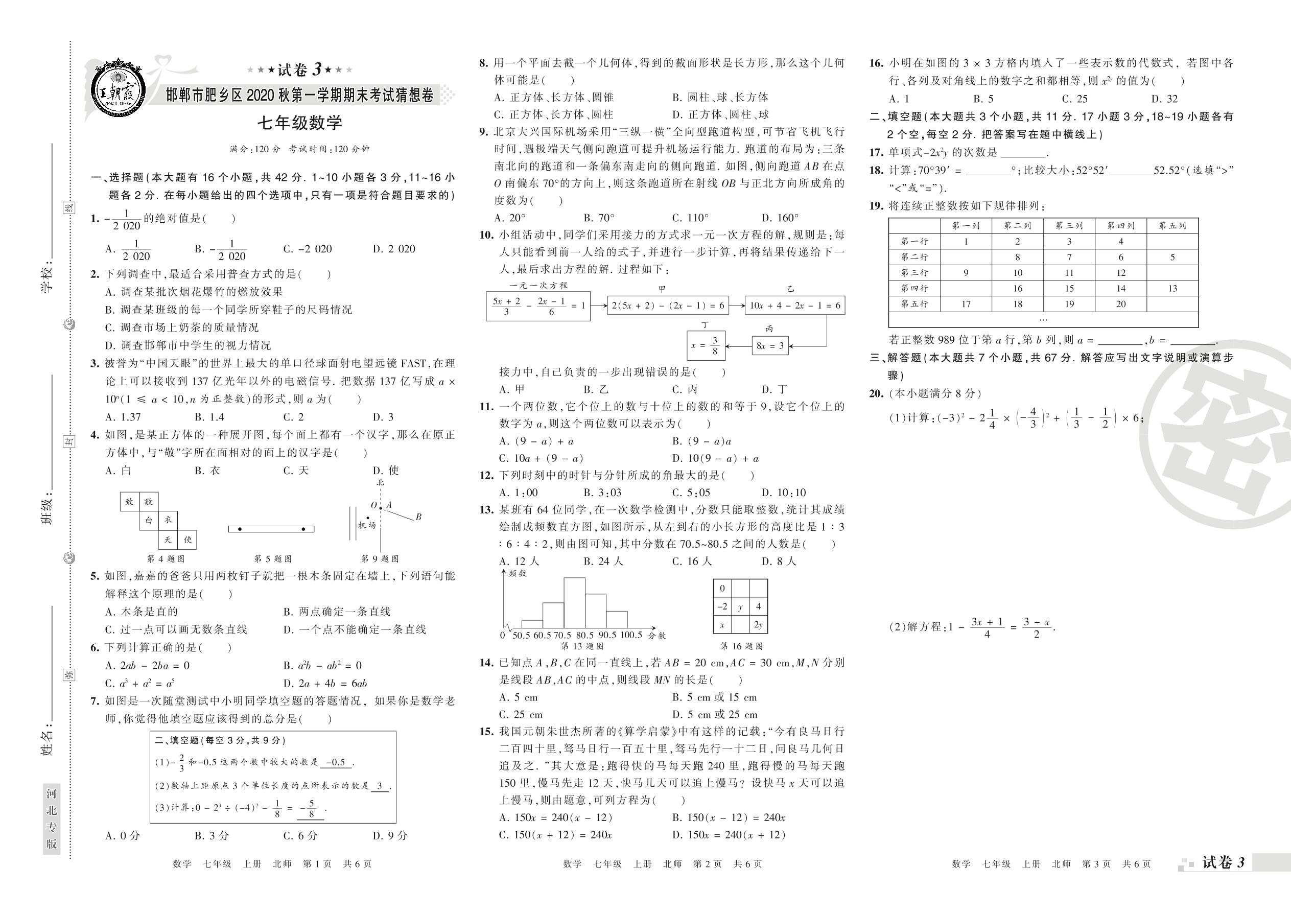 2019-2020学年第一学期邯郸市肥乡区七年级数学试卷(北师版)【3】