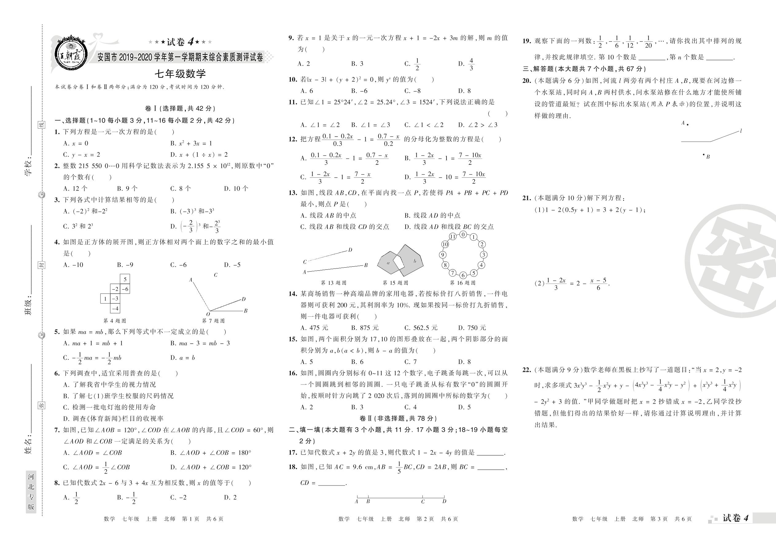 2019-2020学年第一学期安国市七年级数学试卷(北师版)【4】