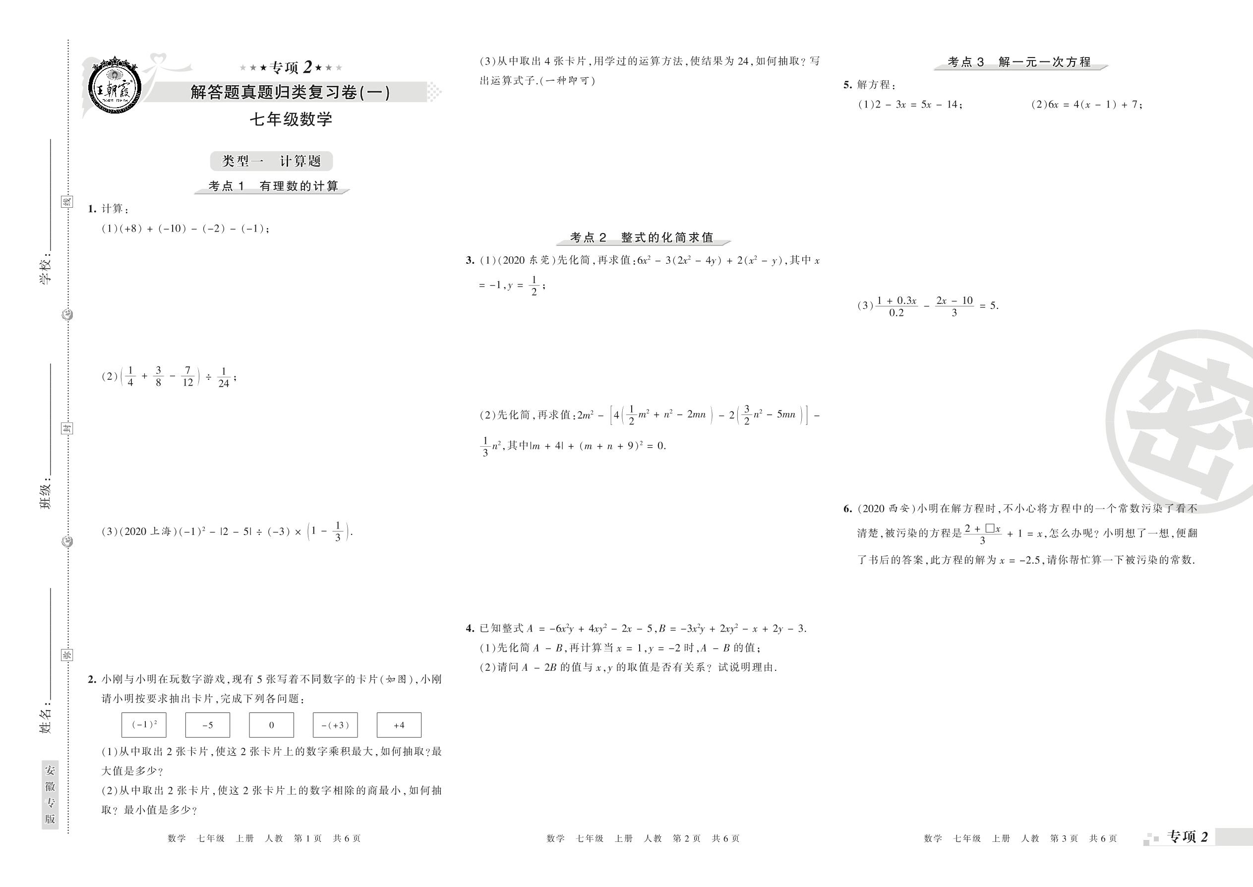 王朝霞期末专项卷——解答题真题归类复习(一)七年级上册数学(人教版)