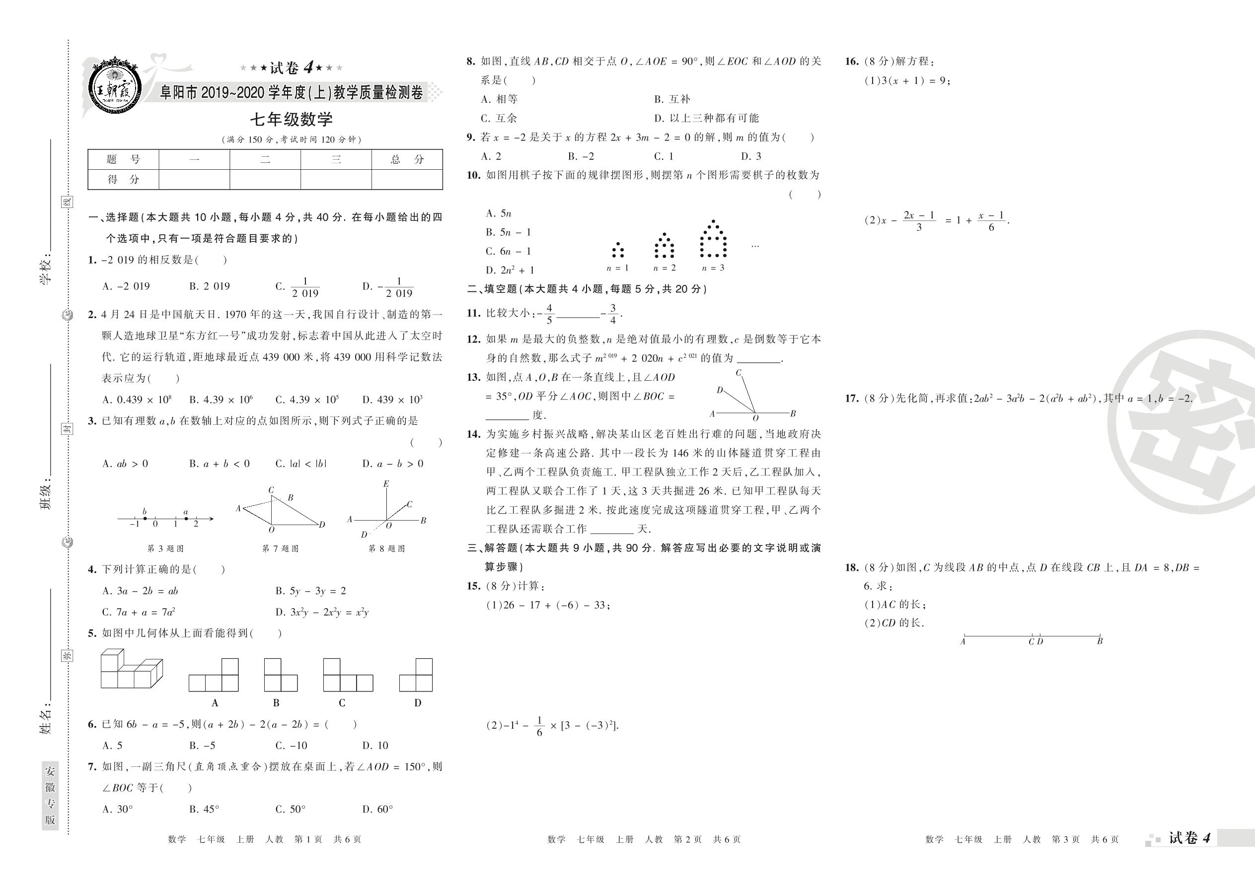 2019-2020学年第一学期阜阳市七年级数学试卷(人教版)【4】
