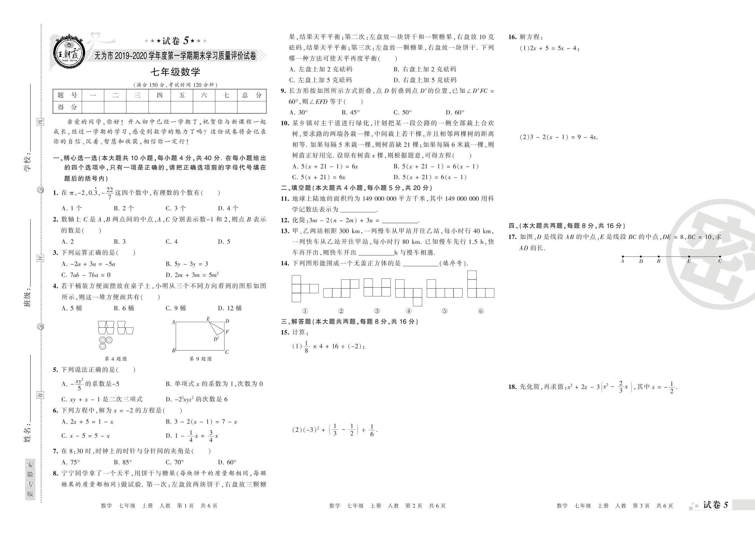 2019-2020学年第一学期无为市七年级数学试卷(人教版)【5】