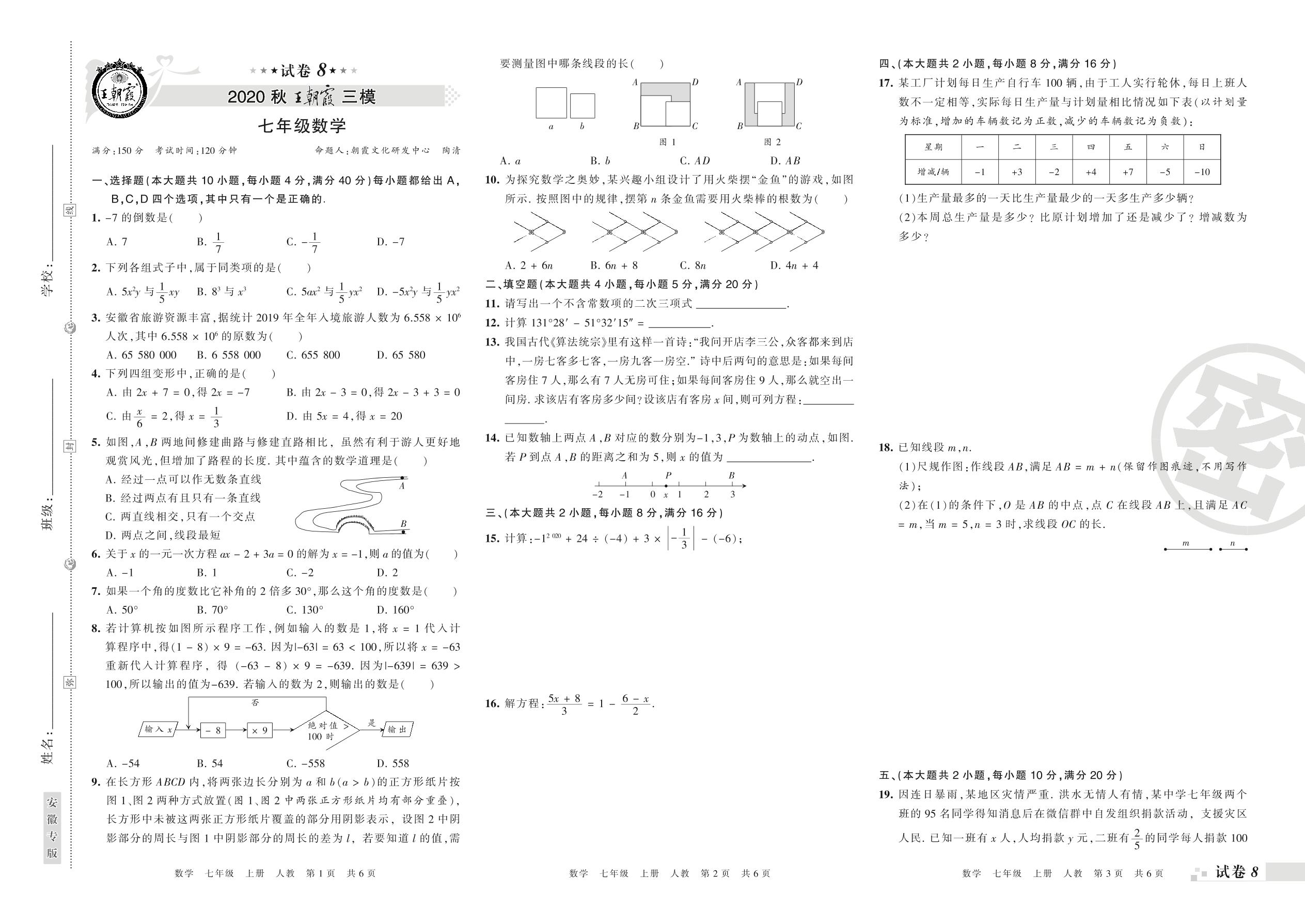 王朝霞期末模拟卷七年级上册数学(人教版)【8】