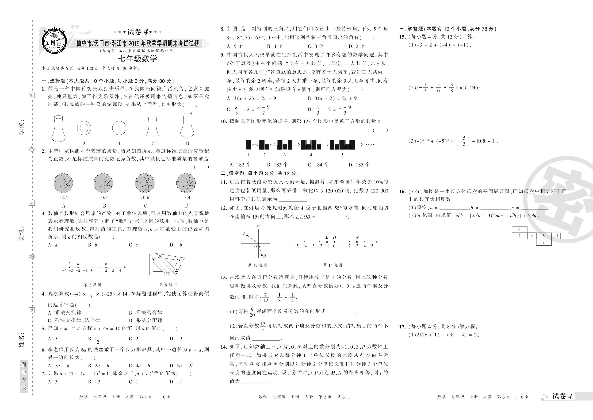 2019-2020学年第一学期仙桃市、天门市、潜江市七年级数学试卷(人教版)【4】