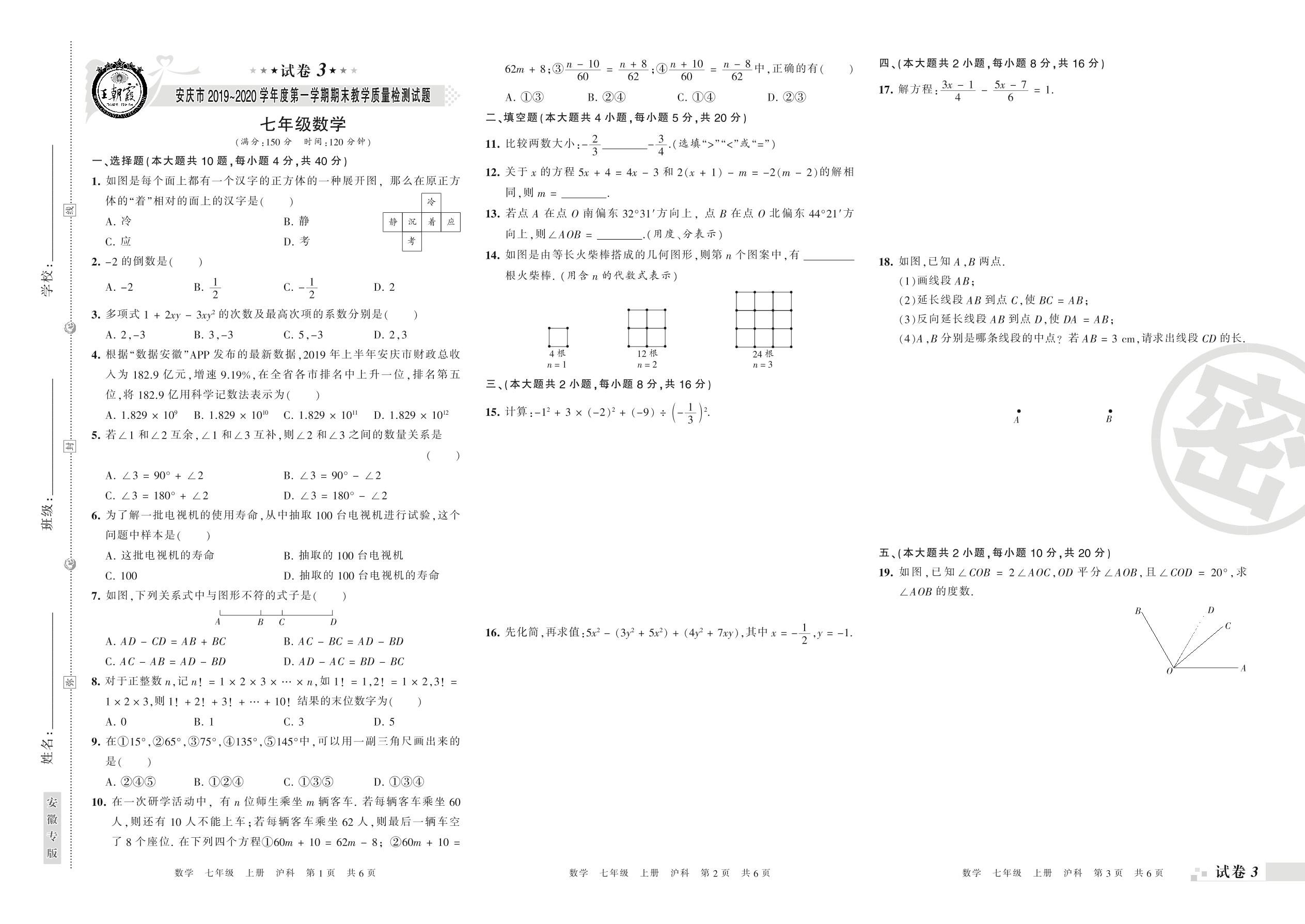 2019-2020学年第一学期安庆市七年级数学试卷(沪科版)【3】