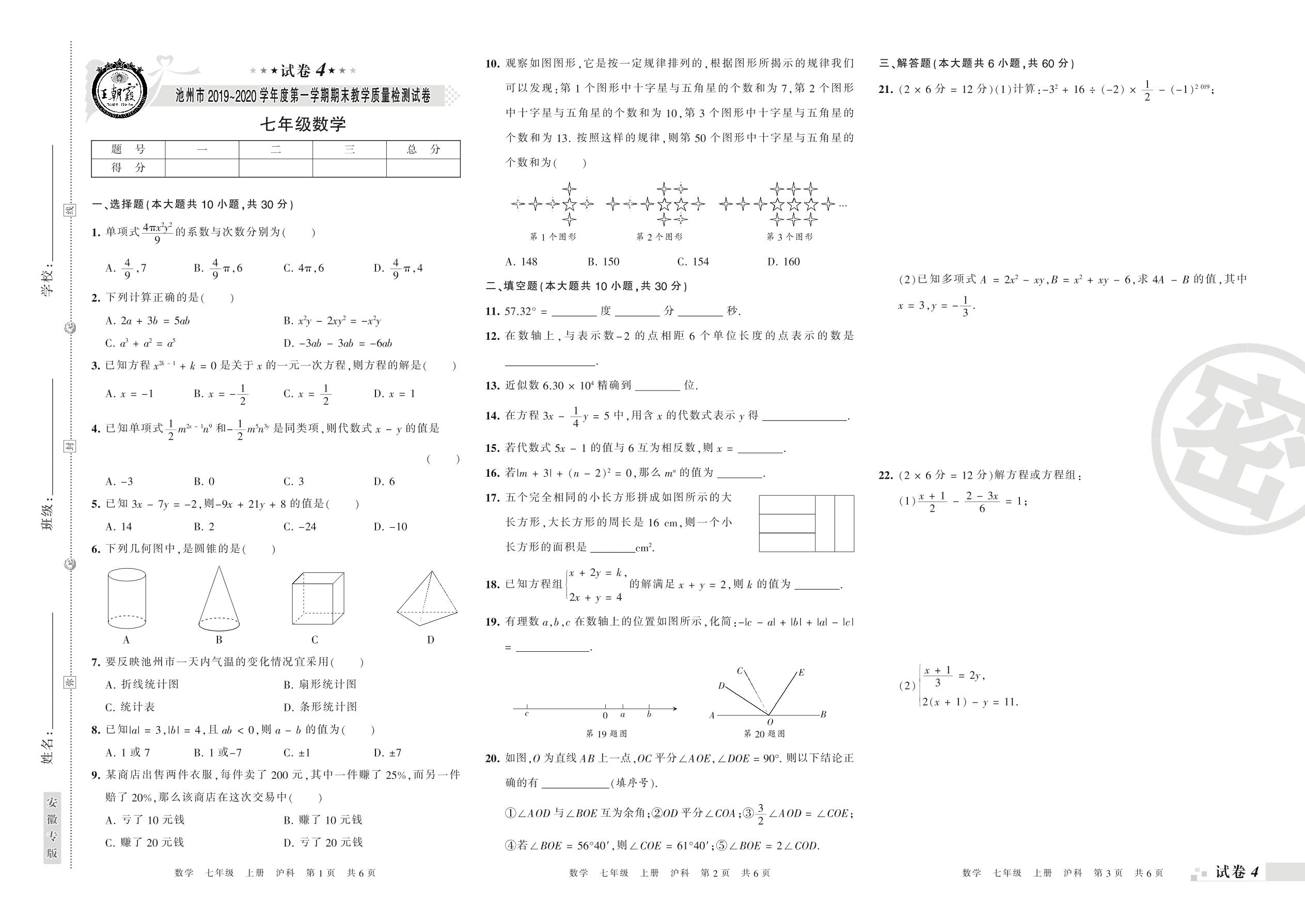 2019-2020学年第一学期池州市七年级数学试卷(沪科版)【4】