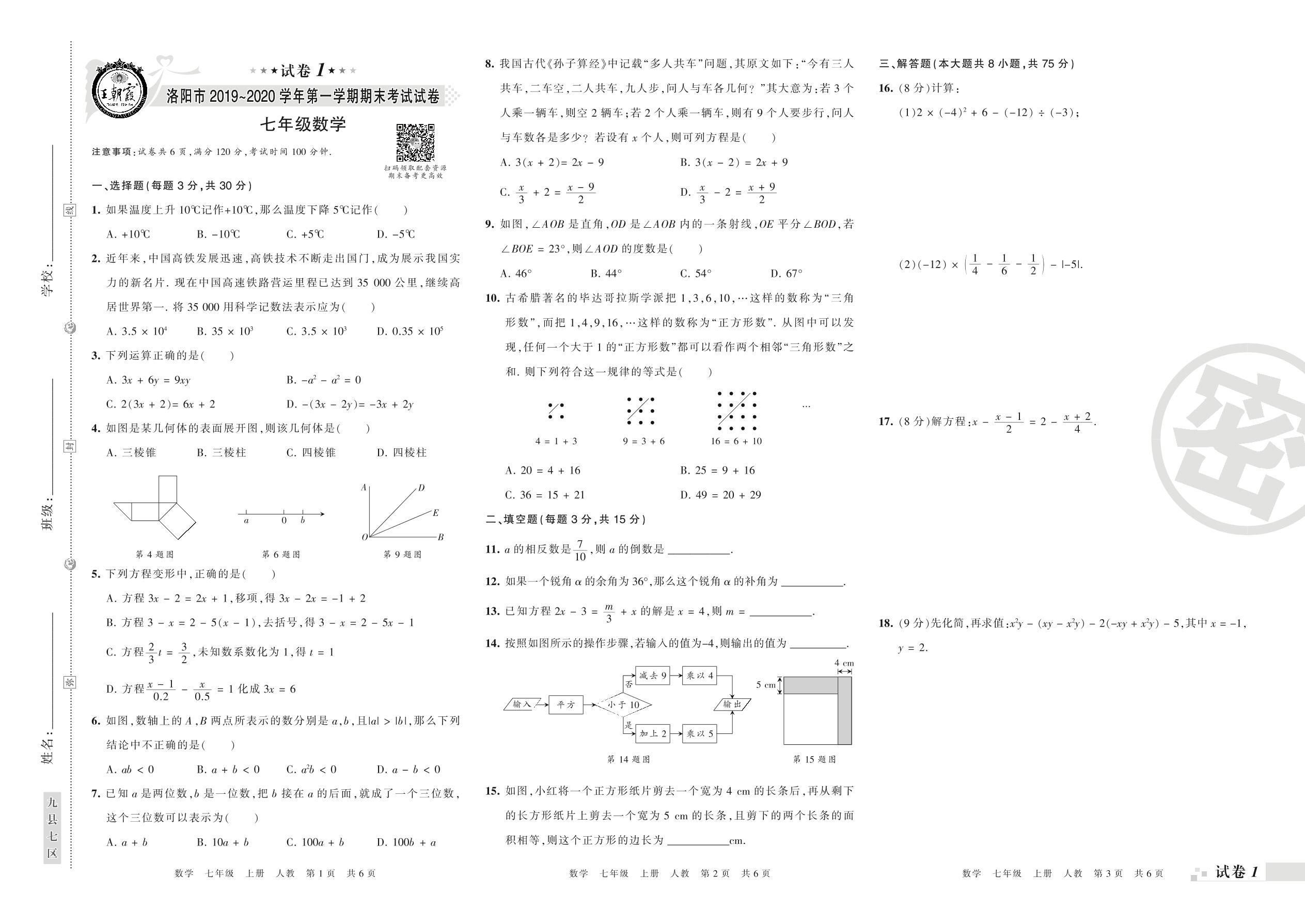 2019-2020学年第一学期洛阳市七年级数学试卷(人教版)_R210805152650【1】
