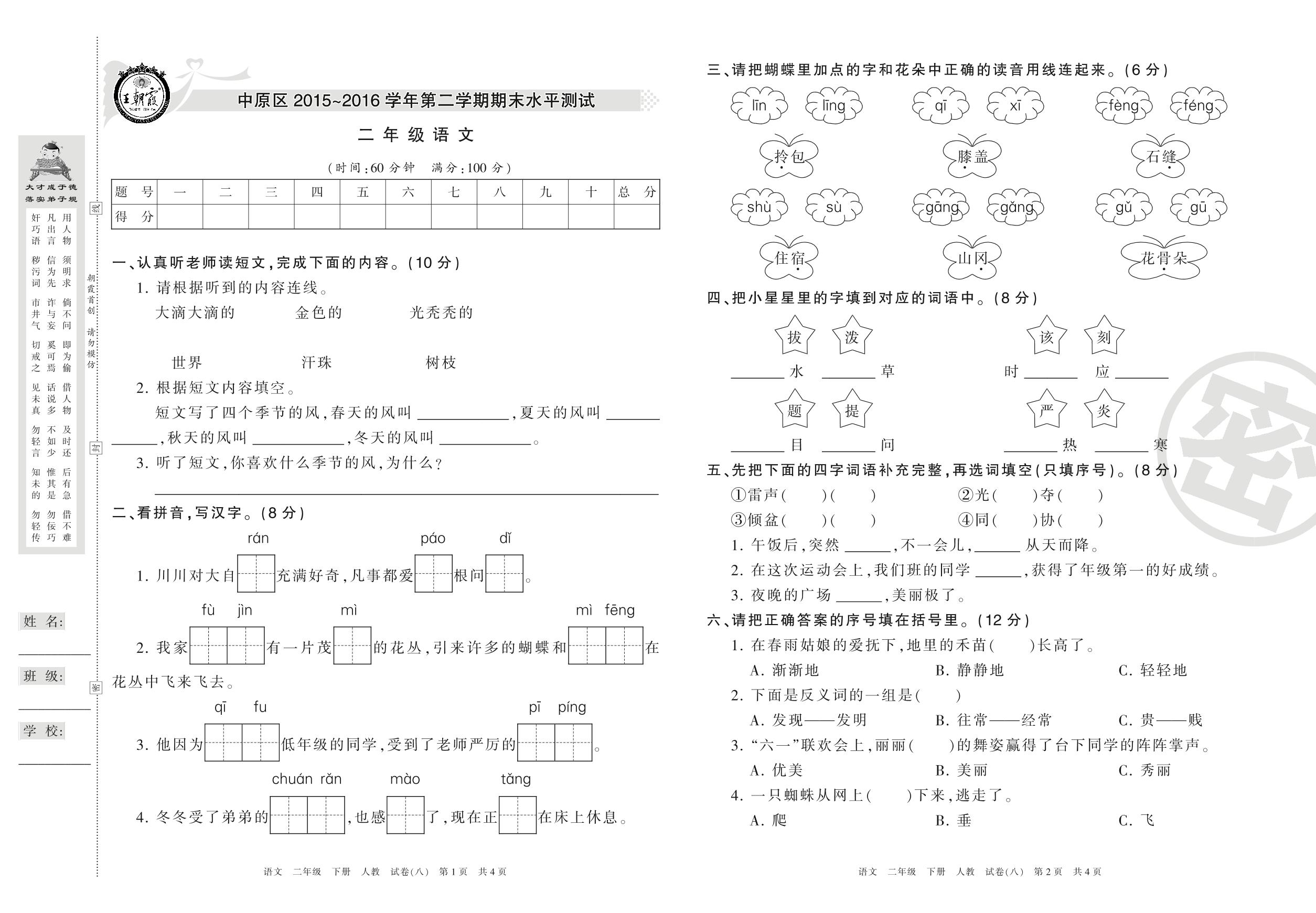 2015-2016学年第二学期郑州市中原区二年级语文试卷(人教版)【8】