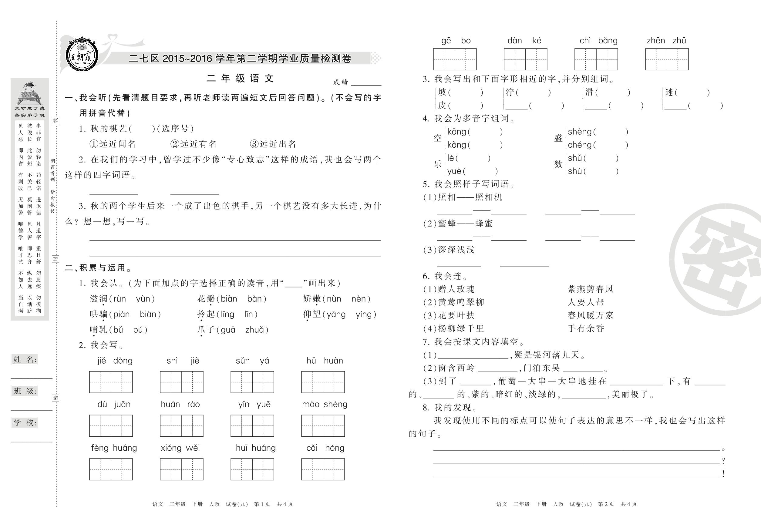 2015-2016学年第二学期郑州市二七区二年级语文试卷(人教版)【9】