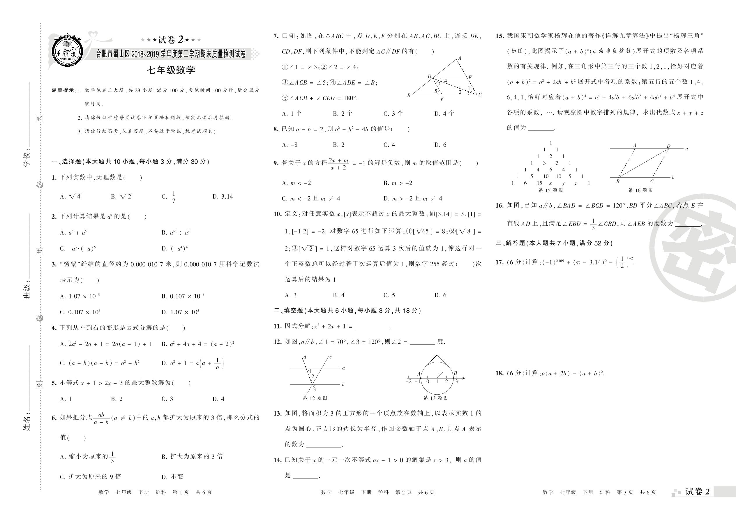 2018-2019学年第二学期合肥市蜀山区七年级数学试卷(沪科版)【2】