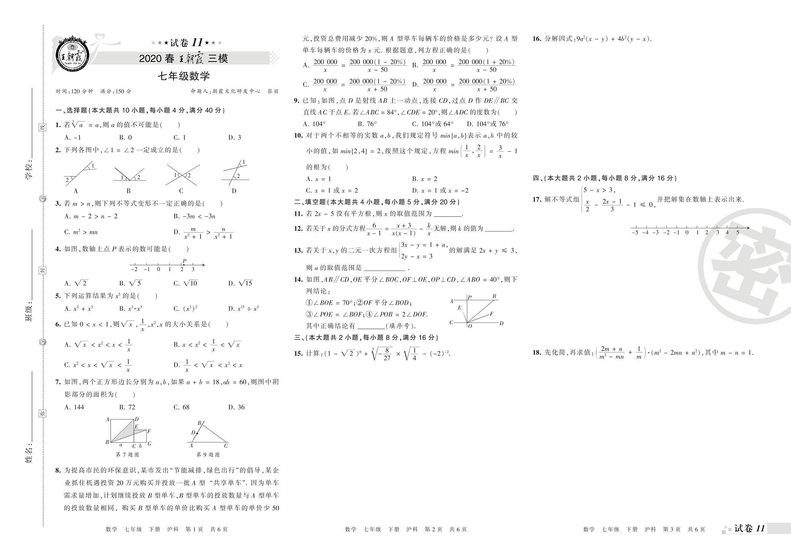 王朝霞期末模拟卷七年级下册数学(沪科版)【11】