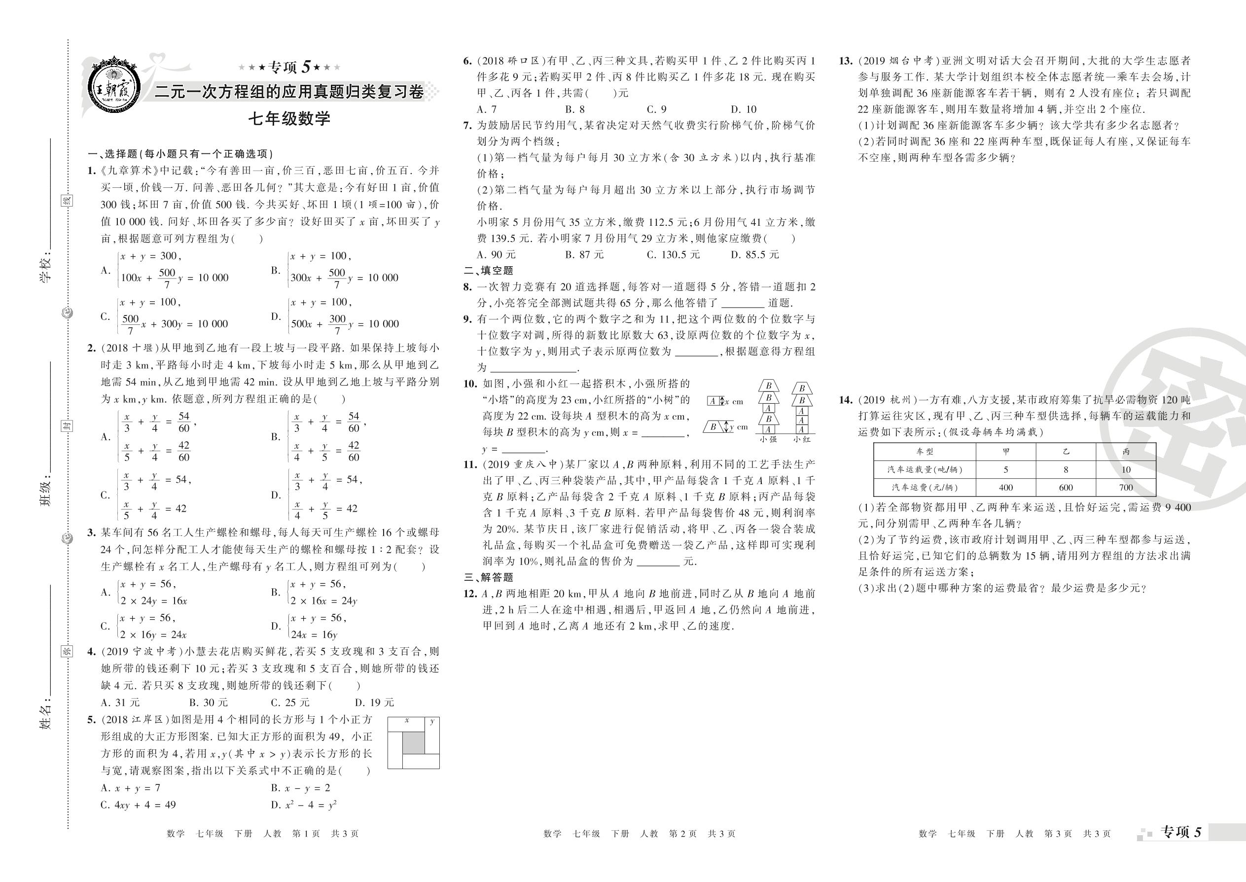 王朝霞期末专项卷——二元一次方程组的应用、不等式与不等式组的认识与解法真题归类复习卷七年级下册数学(人教版)_R210805153645【0】