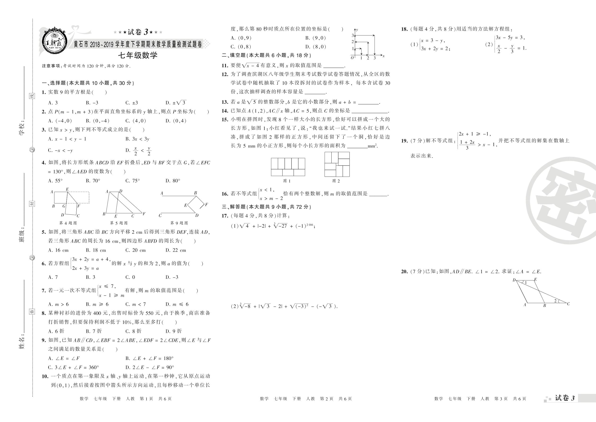2018-2019学年第二学期黄石市七年级数学试卷(人教版)【3】