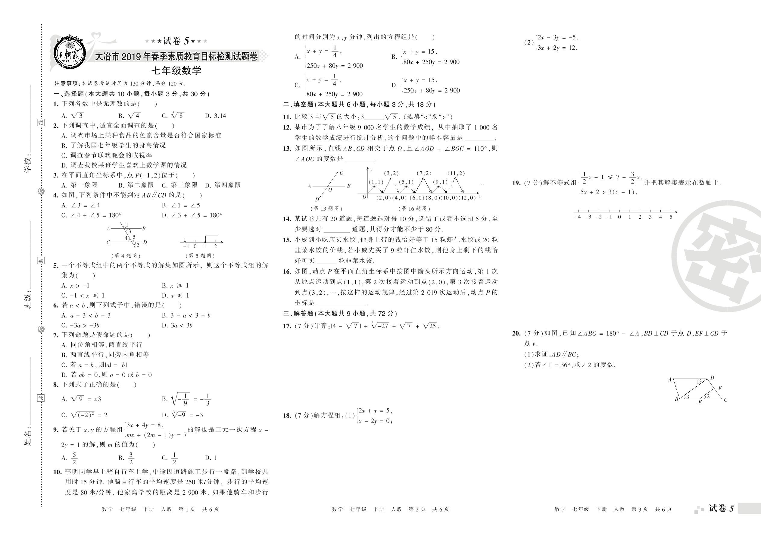 2018-2019学年第二学期大冶市七年级数学试卷(人教版)【5】