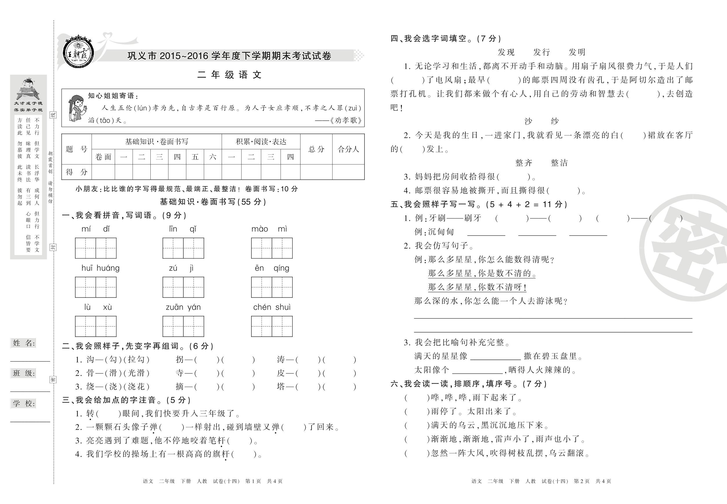 2015-2016学年第二学期巩义市二年级语文试卷(人教版)【14】