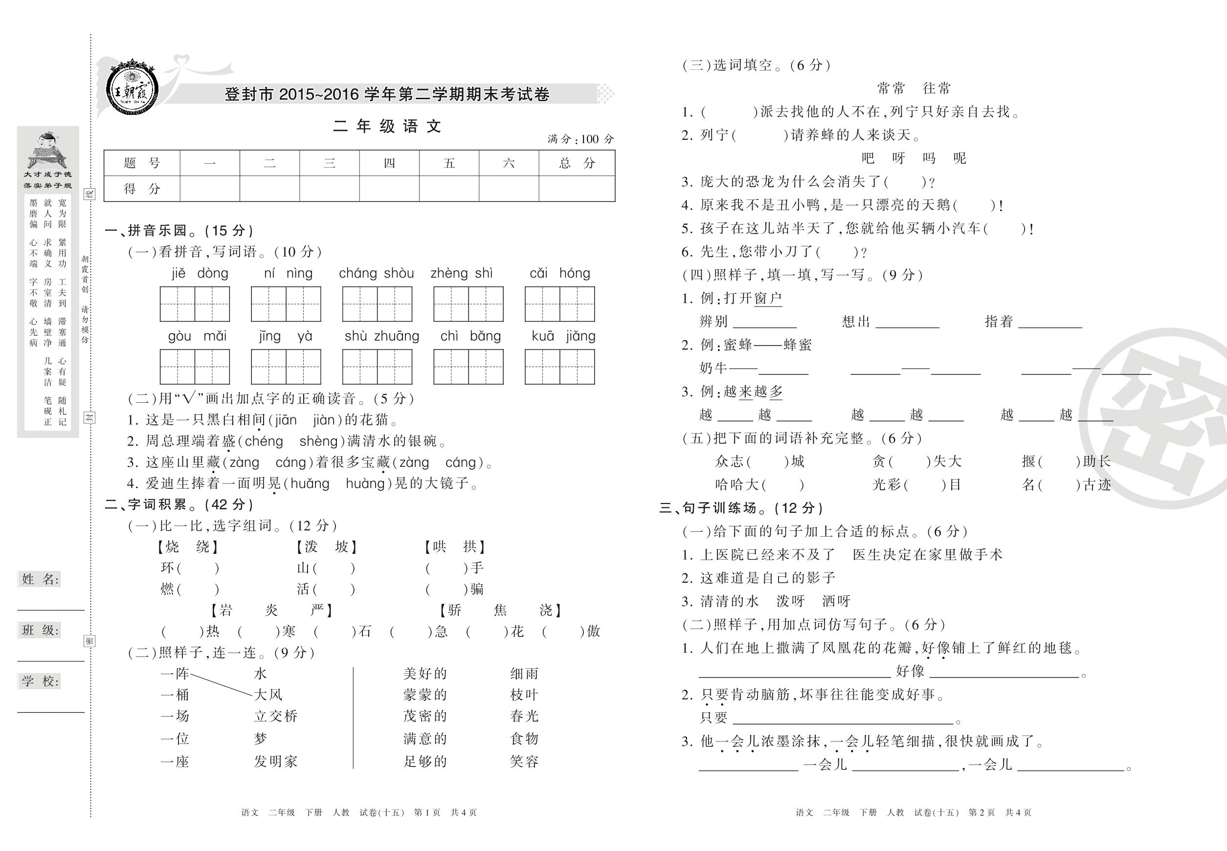 2015-2016学年第二学期登封市二年级语文试卷(人教版)【15】