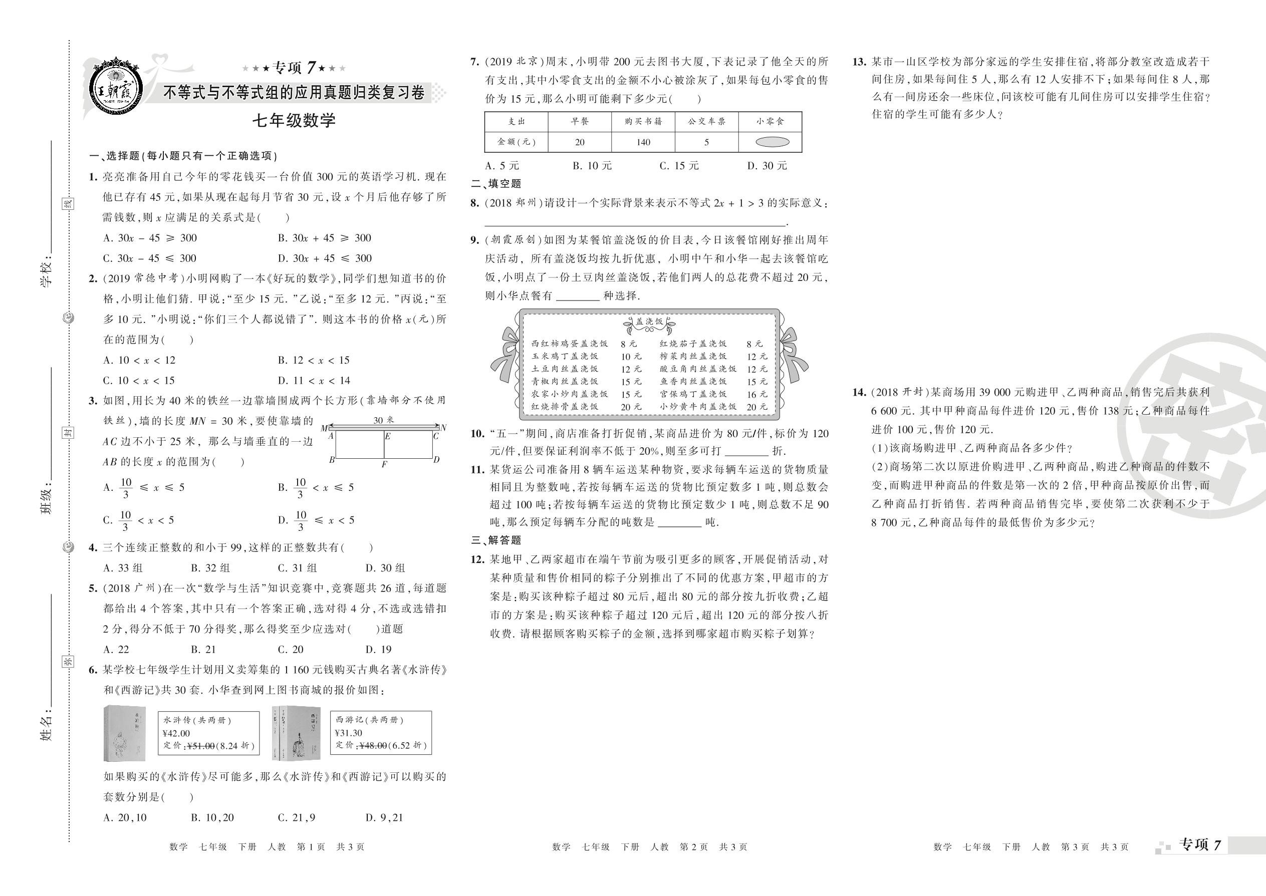 王朝霞期末专项卷——不等式与不等式组的应用、数据的收集、整理与描述真题归类复习卷七年级下册数学(人教版)_R210805154314【0】