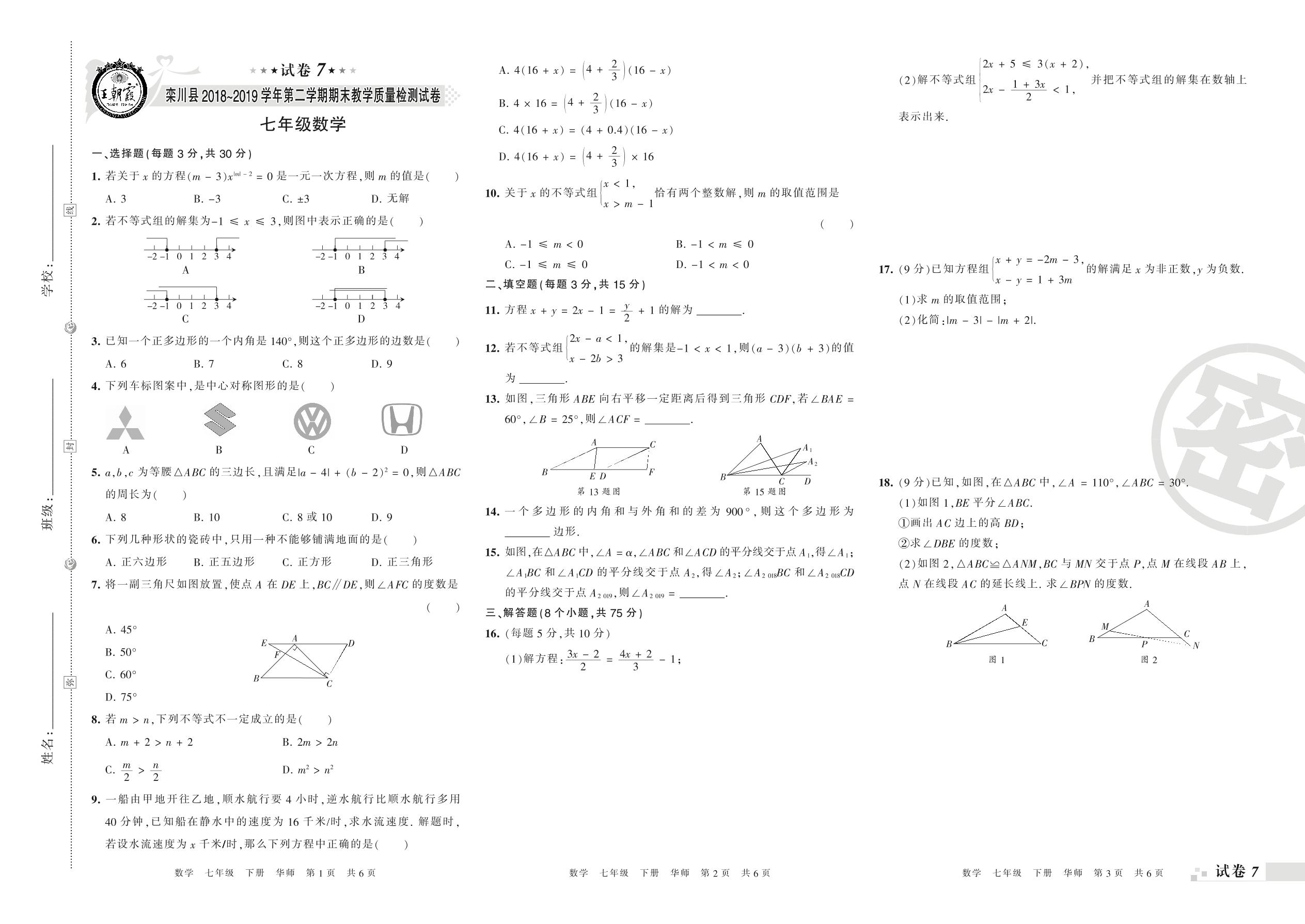 2018-2019学年第二学期洛阳市栾川县七年级数学试卷(华师版)【7】