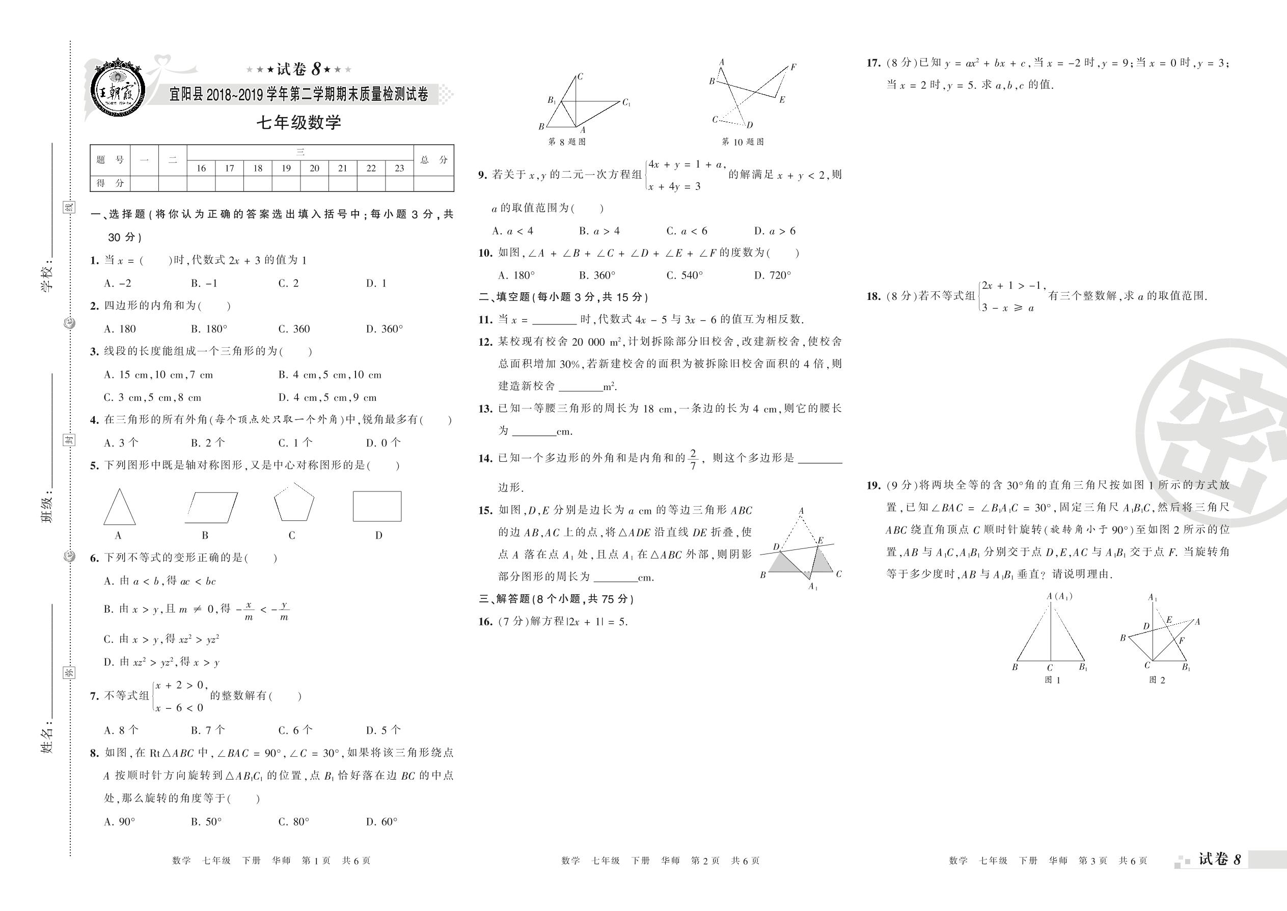 2018-2019学年第二学期洛阳市宜阳县七年级数学试卷(华师版)【8】