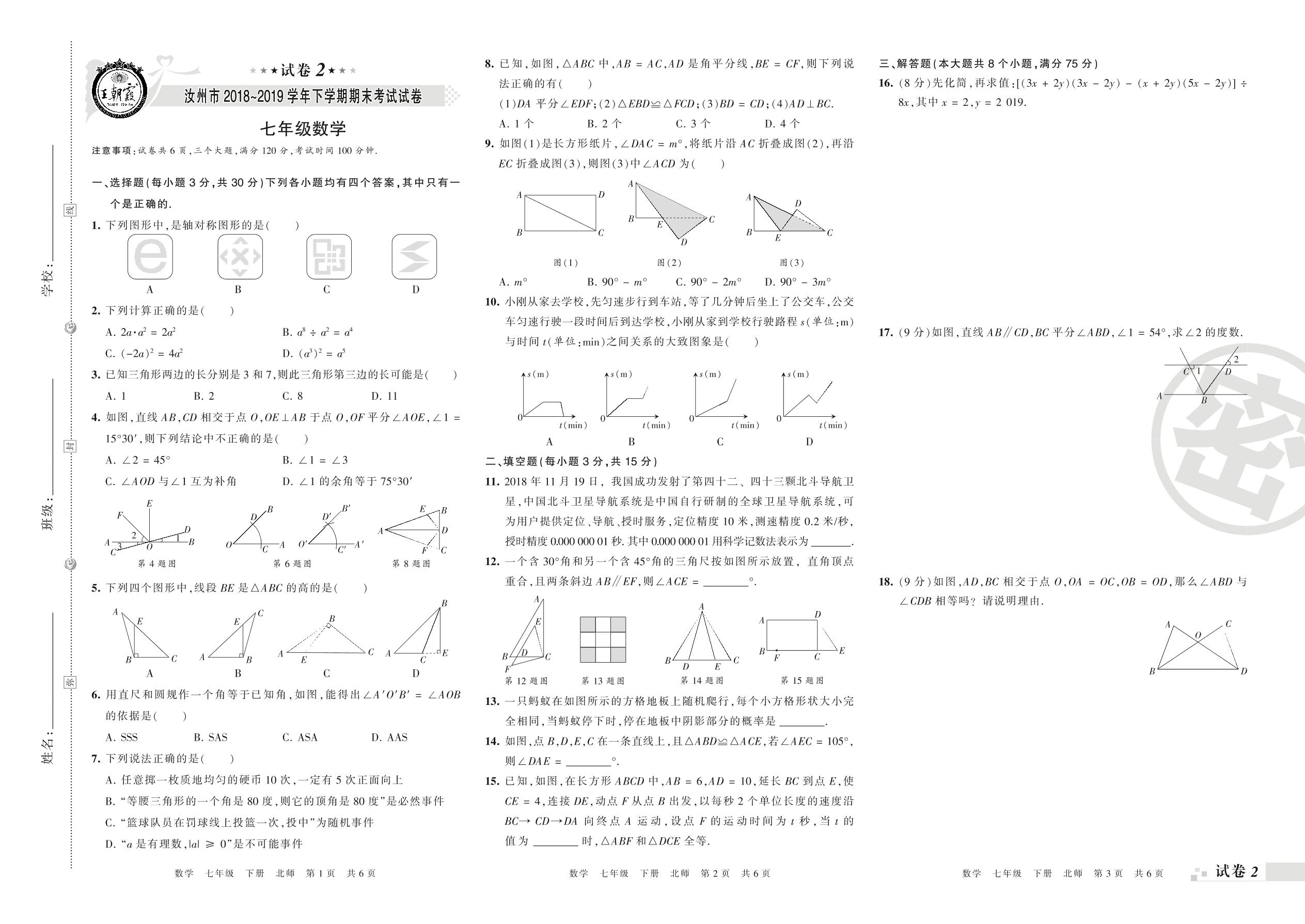 2018-2019学年第二学期汝州市七年级数学试卷(北师版)【2】